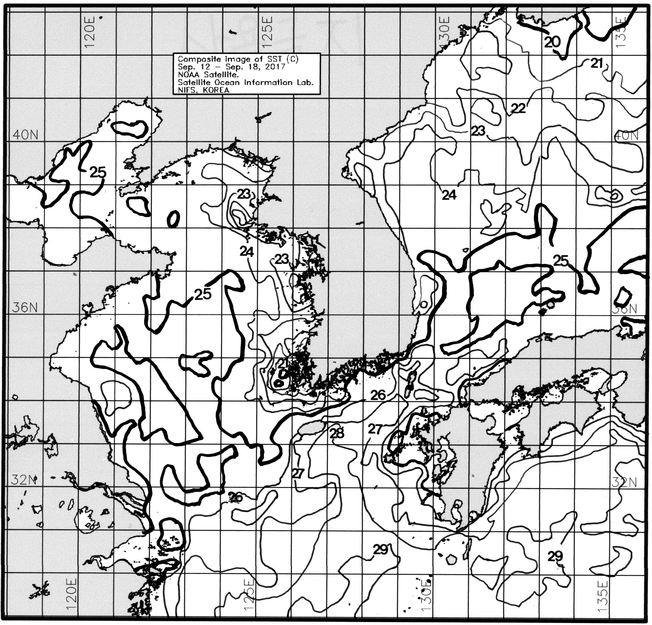 ○ 금주(2017. 09. 12 ~ 2017. 09. 18)의 한국근해 표면수온은 대화퇴 근해 22~23도, 울릉도-독도 근해 24~25도, 대마도 근해 26~27도, 제주도 근해 26~28도, 이어도 근해 25~27도, 가거초 근해 24~25도, 어청도 근해 23~24도, 백령도 근해 22∼23도 로 나타납니다. ○ 「평년에 비해」대화퇴 근해 비슷하게, 울릉도-독도 근해 1도 높게, 대마도 근해 0.7도 높게, 제주도 근해 1.6도 높게, 이어도 근해 비슷하게, 가거초 근해 비슷하게, 어청도 근해 0.4도 높게 나타납니다. ○ 「전년에 비해」대화퇴 비슷하게, 울릉도-독도 근해 1도 높게, 대마도 근해 1.5도 높게, 제주도 근해 2도 높게, 이어도 근해 0.5도 높게, 가거초 근해 0.5도 낮게, 어청도 근해 1도 낮게, 백령도 근해 1.5도 높게 나타납니다.