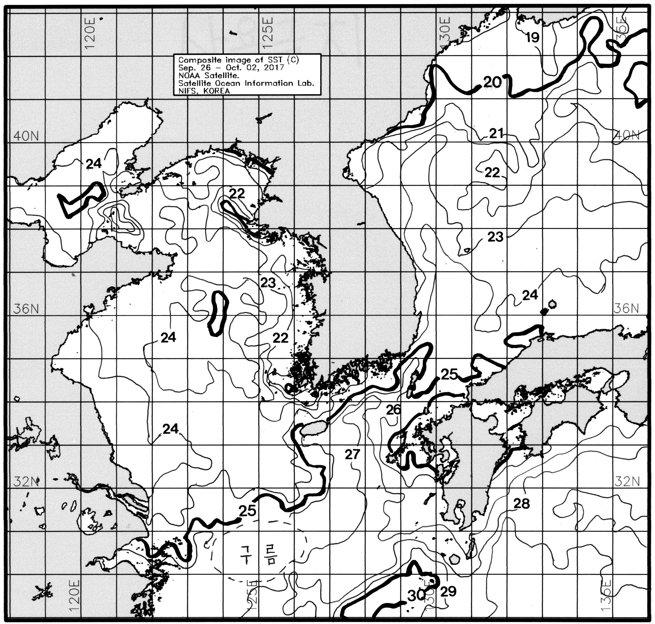 ㅇ 금주(2017. 09. 26 ~ 2017. 10. 02)의 한국근해 표면수온은 대화퇴 근해 21~22도, 울릉도-독도 근해 23~24도, 대마도 근해 25~26도, 제주도 근해 24~26도, 이어도 근해 23~25도, 가거초 근해 23~24도, 어청도 근해 21~23도, 백령도 근해 19∼21도 로 나타납니다. ㅇ 「평년에 비해」대화퇴 근해 비슷하게, 울릉도-독도 근해 1도 높게, 대마도 근해 0.4도 높게, 제주도 근해 비슷하게, 이어도 근해 0.8도 낮게, 가거초 근해 비슷하게, 어청도 근해 0.4도 높게 나타납니다. ㅇ 「전년에 비해」대화퇴 0.5도 낮게, 울릉도-독도 근해 1도 높게, 대마도 근해 0.5도 높게, 제주도 근해 비슷하게, 이어도 근해 2.5도 낮게, 가거초 근해 비슷하게, 어청도 근해 비슷하게, 백령도 근해 0.5도 높게 나타납니다. ㅇ 수온 전선대는 우리나라 제주해협에서 대한해협까지 25도를 중심으로 형성됩니다.