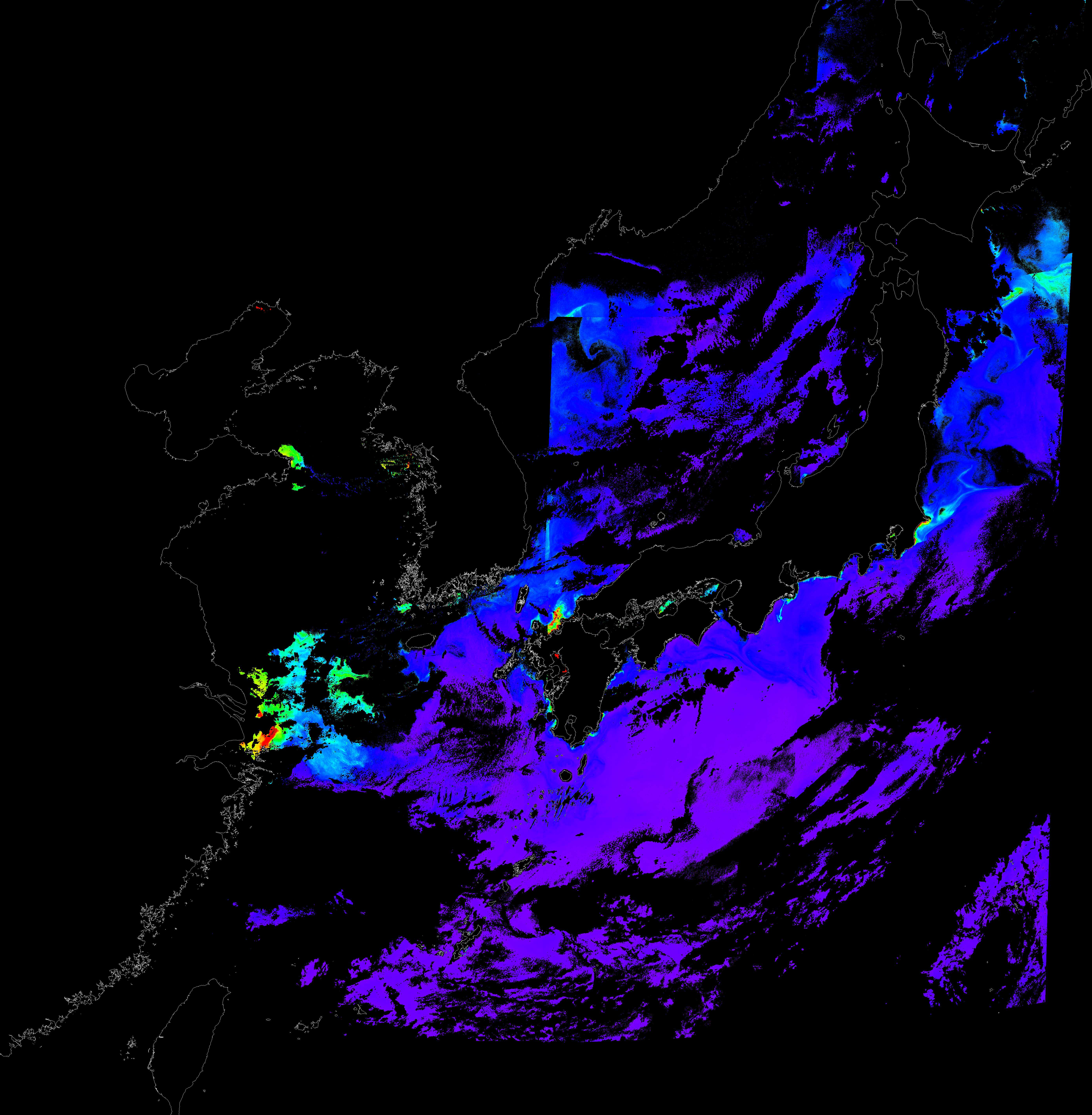 o 2017년 09월 29일 천리안 GOCI 클로로필 a 위성영상입니다. [ GOCI : Geostationary Ocean Color Imager ] o 농도분포는 하단 범례를 참고하시기 바랍니다. o 검은색은 구름을 나타냅니다.