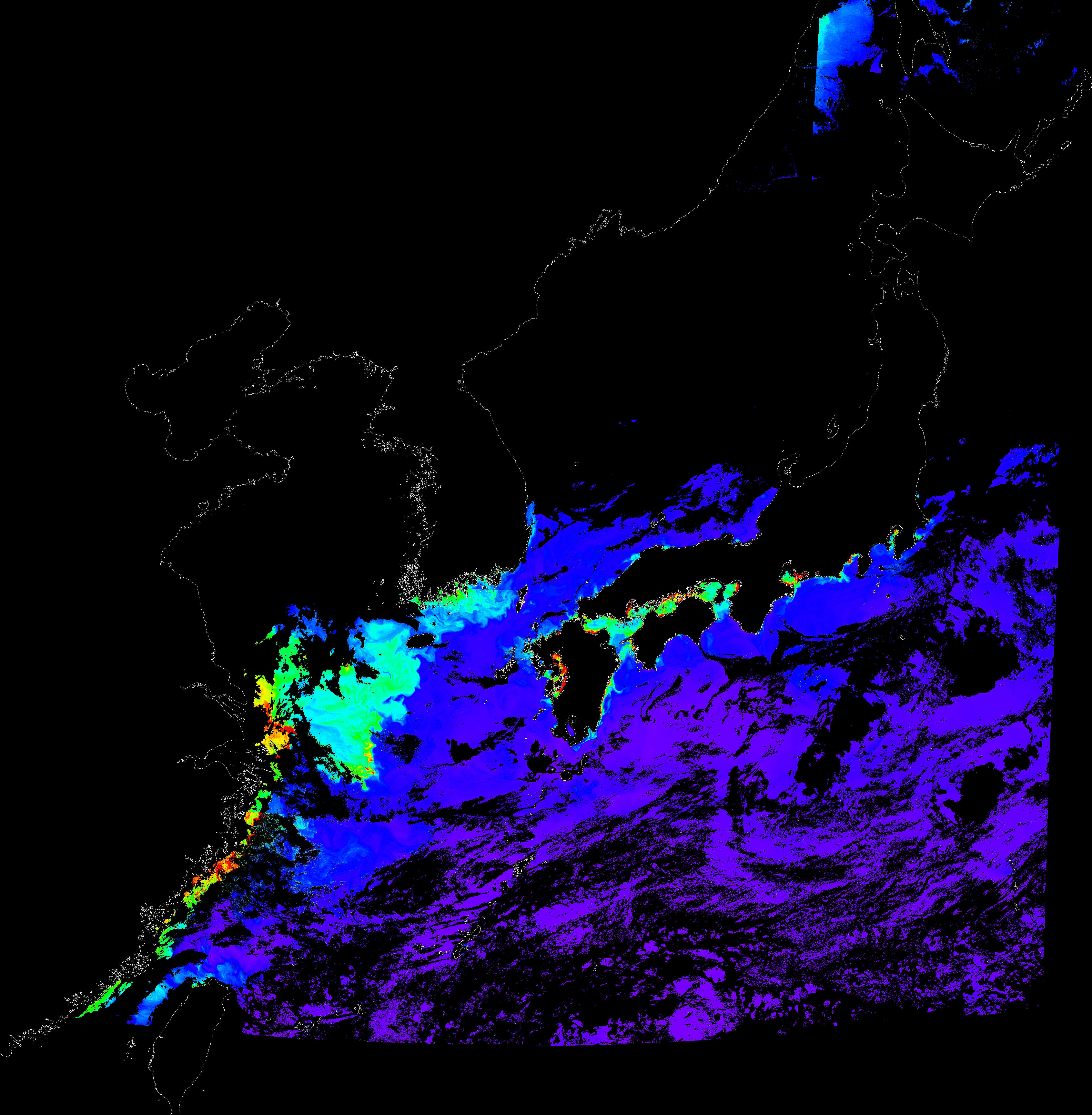 o 2017년 10월 10일 천리안 GOCI 클로로필 a 위성영상입니다. [ GOCI : Geostationary Ocean Color Imager ] o 농도분포는 하단 범례를 참고하시기 바랍니다. o 검은색은 구름을 나타냅니다.