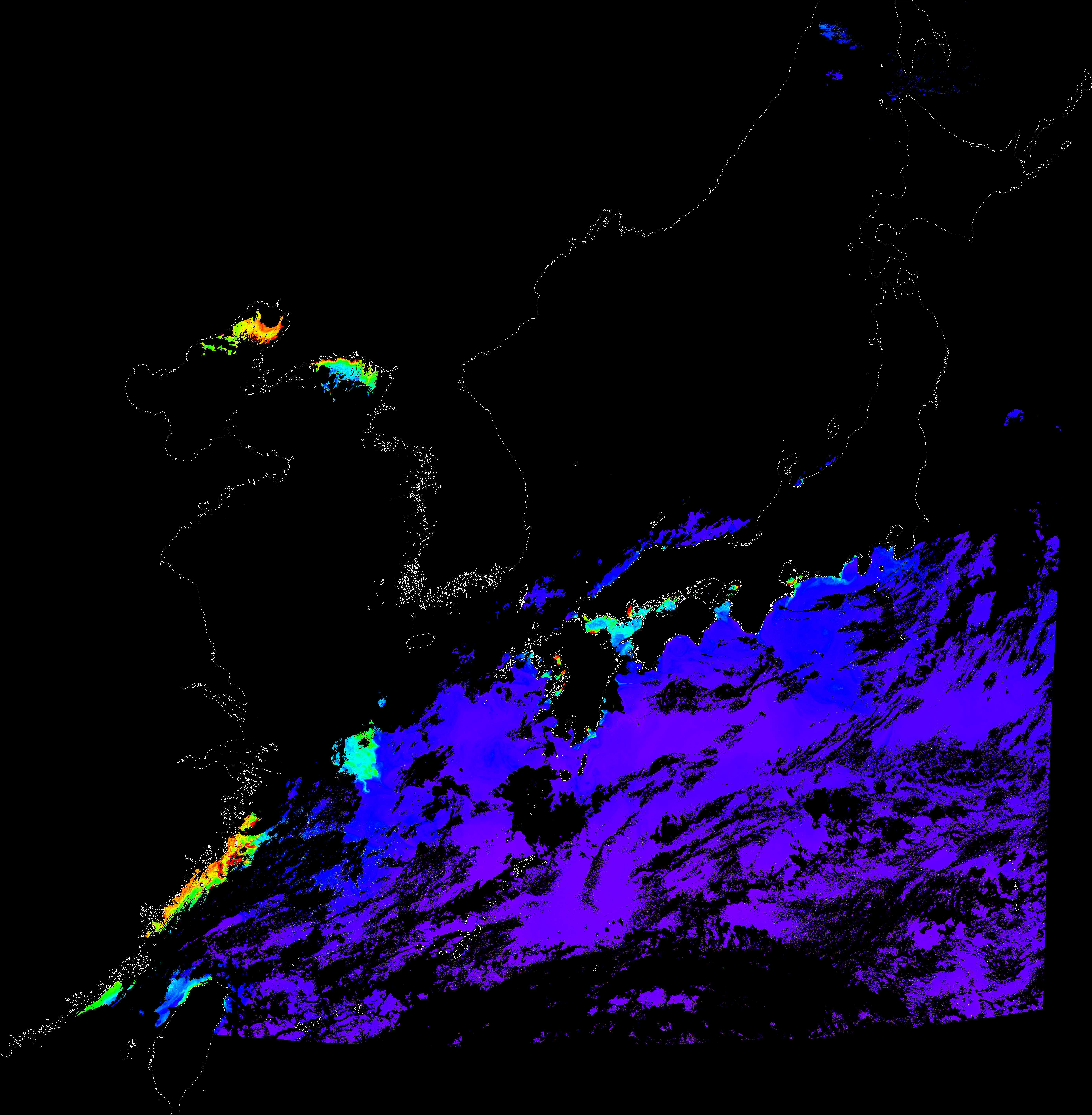 o 2017년 10월 11일 천리안 GOCI 클로로필 a 위성영상입니다. [ GOCI : Geostationary Ocean Color Imager ] o 농도분포는 하단 범례를 참고하시기 바랍니다. o 검은색은 구름을 나타냅니다.