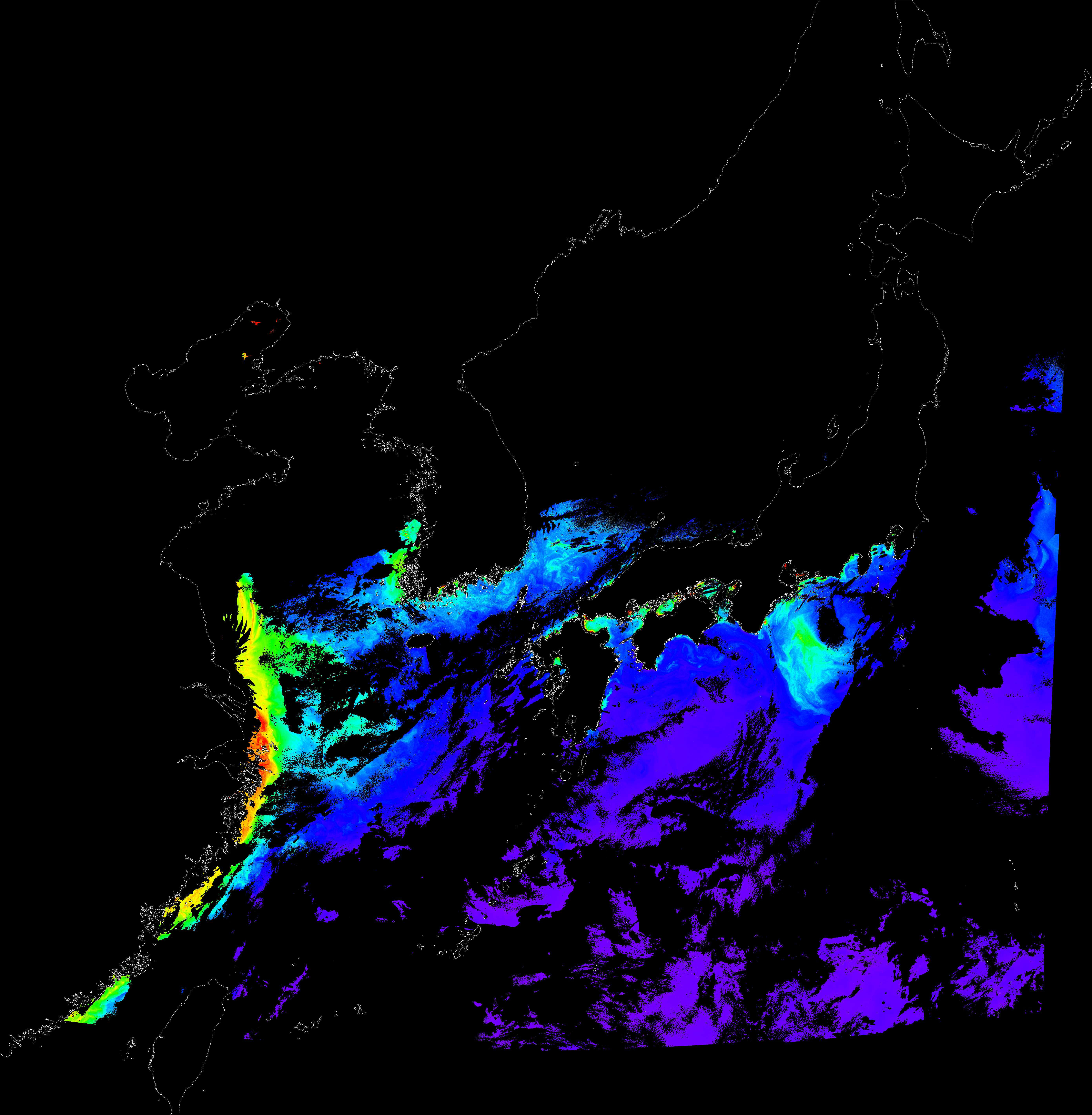 o 2017년 11월 01일 천리안 GOCI 클로로필 a 위성영상입니다. [ GOCI : Geostationary Ocean Color Imager ] o 농도분포는 하단 범례를 참고하시기 바랍니다. o 검은색은 구름을 나타냅니다.