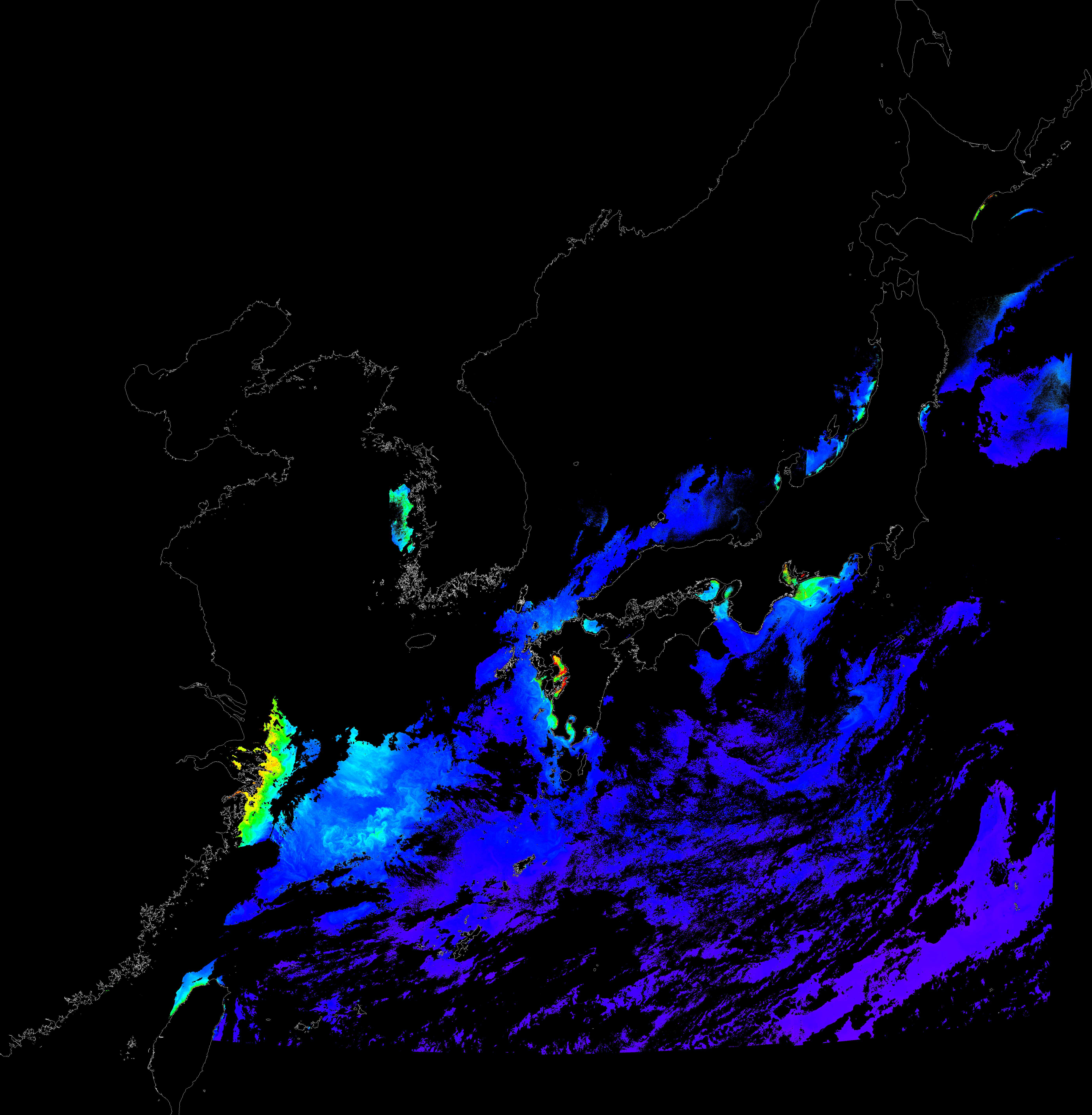 o 2017년 11월 28일 천리안 GOCI 클로로필 a 위성영상입니다. [ GOCI : Geostationary Ocean Color Imager ] o 농도분포는 하단 범례를 참고하시기 바랍니다. o 검은색은 구름을 나타냅니다.