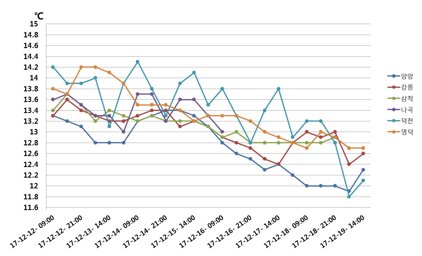 ○ 국립수산과학원 실시간 해양환경 어장정보시스템에서 관측된 동해(양양, 강릉, 삼척, 나곡, 덕천, 영덕)의 최근 1주일(09시, 14시, 21시)간 수온 변화 경향은 아래와 같습니다. (2017.12.12.~12.19). ○ 12월 19일 14시 현재 양양 12.3℃, 강릉 12.6℃, 삼척 12.7℃, 나곡 12.3℃, 덕천 12.1℃, 영덕 12.7℃의 수온을 나타내며, 지난주에 비하여 2℃이상 낮은 수온을 보이고 있습니다. ○ 겨울철 한파에 따른 수온의 추가적인 하강이 우려됩니다. ○ 수온의 급하강은 양식생물의 생리생태 변화, 균형 소실 등에 의해 생존에 영향을 줄 수 있어, 특히 연안/내만의 천해 양식장에서는 저수온에 따른 양식생물 등의 피해 예방에 안전을 기해 주시기 바라며, 국립수산과학원의 실시간 수온정보에 관심을 기울여 주시기 바랍니다.