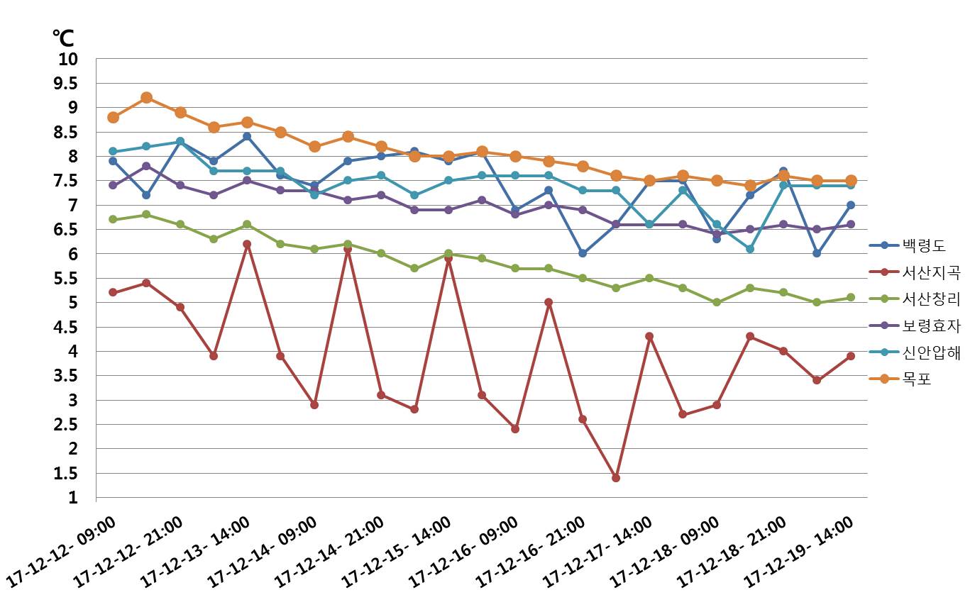 ○ 국립수산과학원 실시간 해양환경 어장정보시스템에서 관측된 서해(백령도, 서산지곡, 서산창리, 보령효자, 신안압해, 목포)의 최근 1주일(09시, 14시, 21시)간 수온 변화 경향은 아래와 같습니다. (2017.12.12.~12.19). ○ 12월 19일 14시 현재 백령도, 신안압해, 보령효자, 목포 등은 6.5∼7.5℃ 내외 서산창리 5.1℃, 서산지곡 3.9℃의 수온을 나타내며, 지난주에 비하여 1∼2℃ 낮은 수온을 보이고 있습니다. ○ 겨울철 한파에 따른 수온의 추가적인 하강이 우려됩니다. ○ 수온의 급하강은 양식생물의 생리생태 변화, 균형 소실 등에 의해 생존에 영향을 줄 수 있어, 특히 연안/내만의 천해 양식장에서는 저수온에 따른 양식생물 등의 피해 예방에 안전을 기해 주시기 바라며, 국립수산과학원의 실시간 수온정보에 관심을 기울여 주시기 바랍니다.