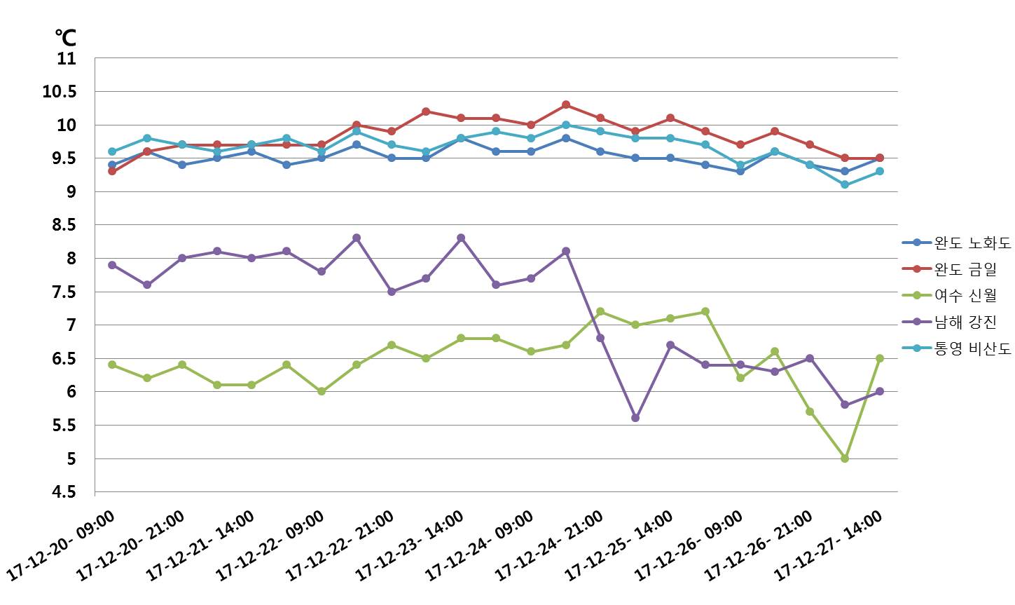 ○ 국립수산과학원 실시간 해양환경 어장정보시스템에서 관측된 남해(완도 노화도, 완도 금일, 여수신월, 남해강진, 통영비산도)의 최근 1주일(09시, 14시, 21시)간 수온 변화 경향은 아래와 같습니다. (2017.12.20.~12.27). ○ 12월 27일 14시 현재 완도 노화도 9.5℃, 완도 금일 9.5℃, 통영비산도 9.3℃, 여수신월 6.5℃, 남해강진 6.0℃의 수온을 나타내며, 지난주에 비하여 1∼2℃ 낮은 수온을 보이고 있습니다. ○ 겨울철 한파에 따른 수온의 추가적인 하강이 우려됩니다. ○ 수온의 급하강은 양식생물의 생리생태 변화, 균형 소실 등에 의해 생존에 영향을 줄 수 있어, 특히 연안/내만의 천해 양식장에서는 저수온에 따른 양식생물 등의 피해 예방에 안전을 기해 주시기 바라며, 국립수산과학원의 실시간 수온정보에 관심을 기울여 주시기 바랍니다.