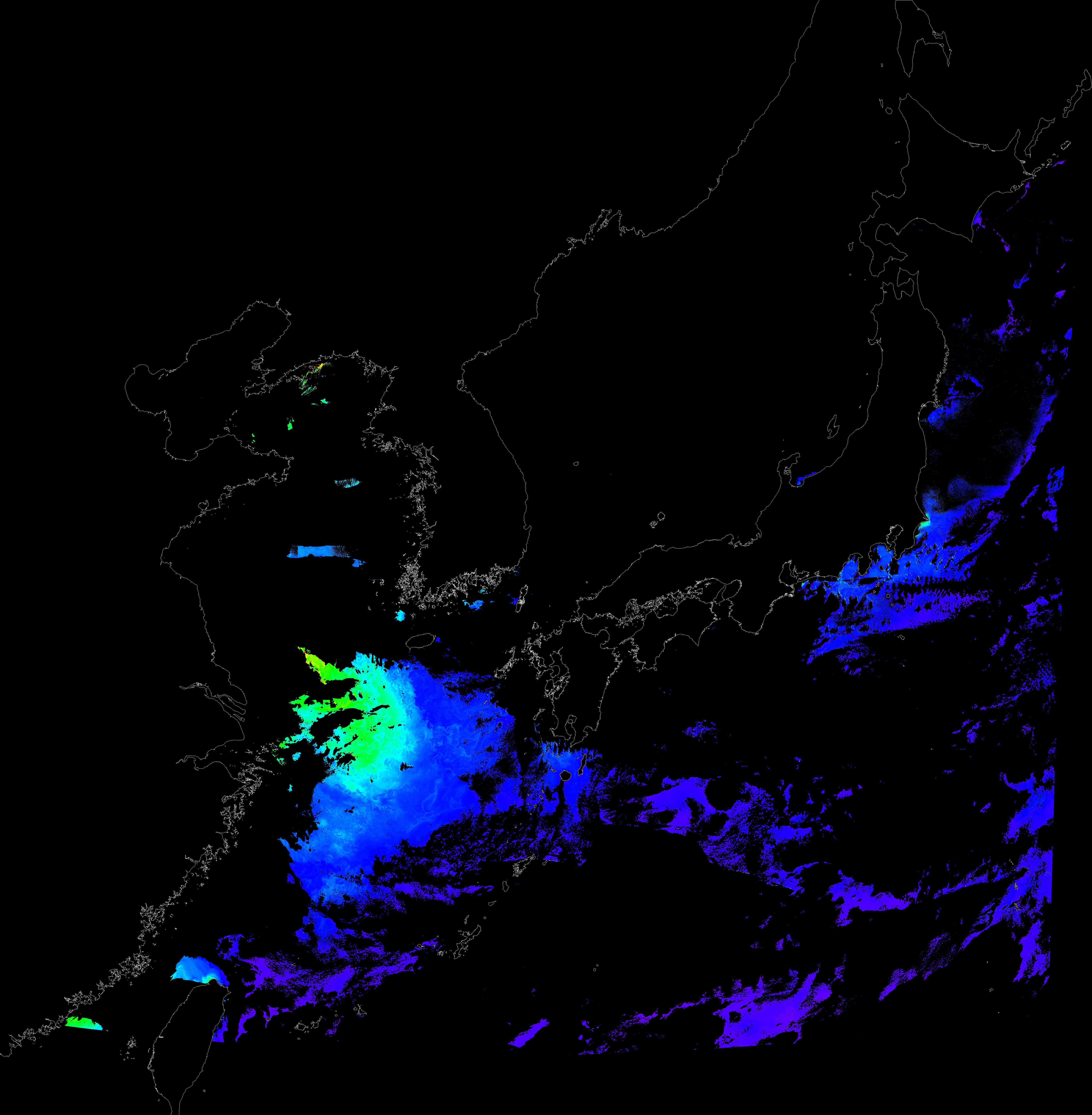 o 2017년 12월 23일 천리안 GOCI 클로로필 a 위성영상입니다. [ GOCI : Geostationary Ocean Color Imager ] o 농도분포는 하단 범례를 참고하시기 바랍니다. o 검은색은 구름을 나타냅니다.