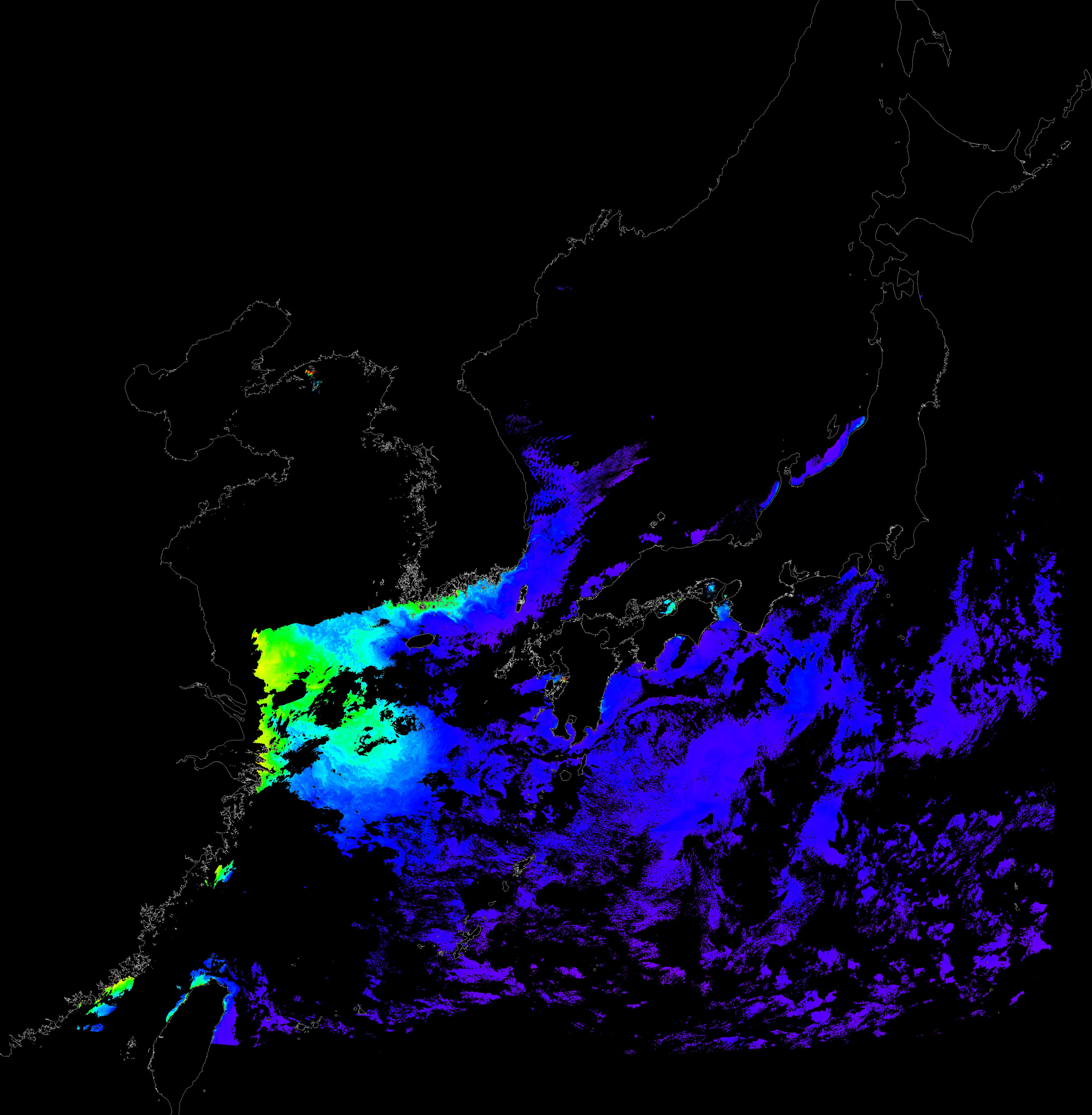 o 2018년 01월 15일 천리안 GOCI 클로로필 a 위성영상입니다. [ GOCI : Geostationary Ocean Color Imager ] o 농도분포는 하단 범례를 참고하시기 바랍니다. o 검은색은 구름을 나타냅니다.