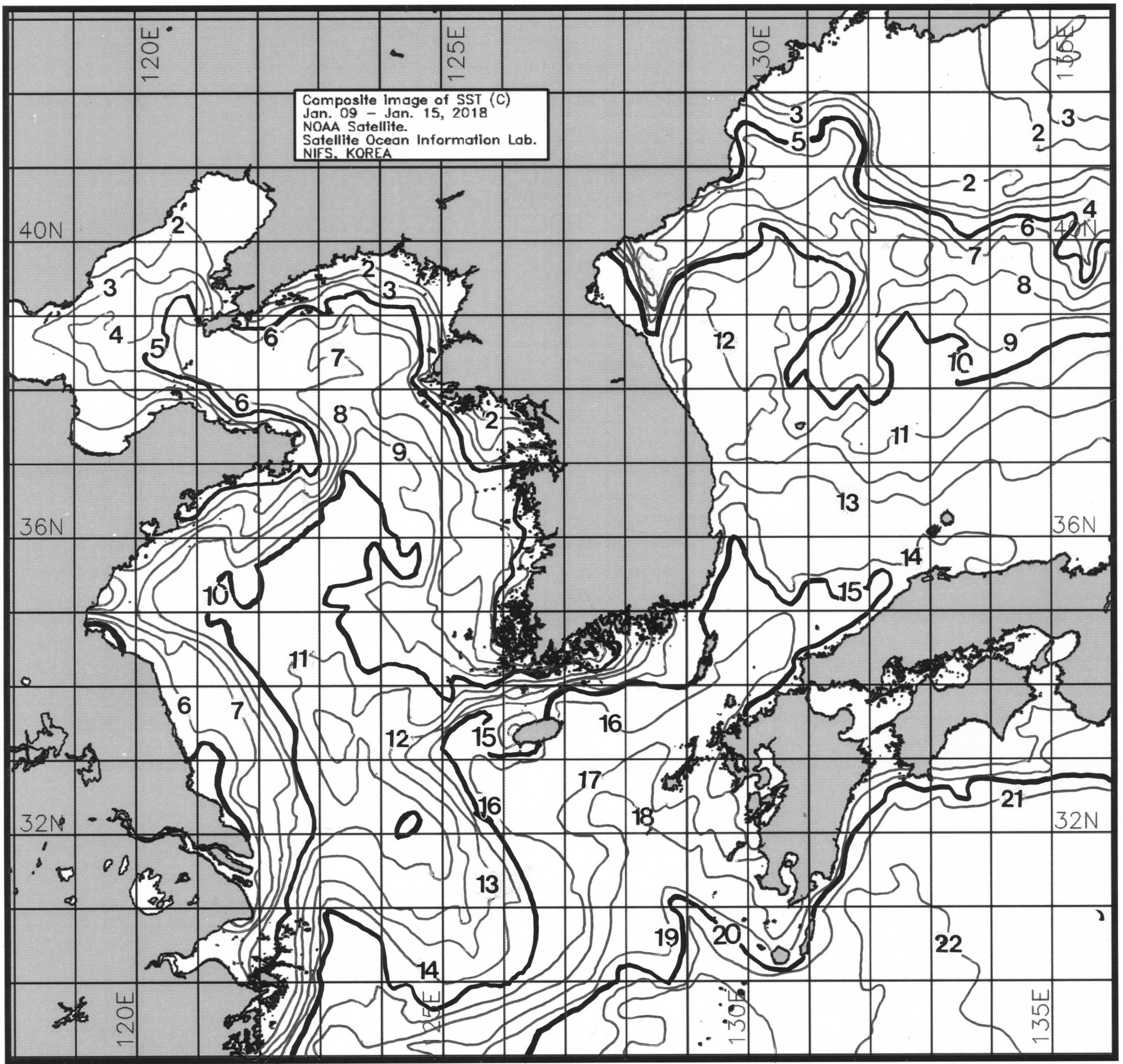 ○ 금주(2018. 1. 9 ~ 2018. 1. 15)의 한국근해 표면수온은 대화퇴 근해 5~7도, 울릉도-독도 근해 10~12도, 대마도 근해 15~16도, 제주도 근해 14~15도, 이어도 근해 11~12도, 가거초 근해 9~10도, 어청도 근해 6~7도, 백령도 근해 4∼6도 로 나타납니다. ○ 「평년에 비해」대화퇴 근해 3.1도 낮게, 울릉도-독도 근해 1.8도 낮게, 대마도 근해 1도 낮게, 제주도 근해 1.4도 낮게, 이어도 근해 1도 낮게, 가거초 근해 2도 낮게, 어청도 근해 1.2도 낮게 나타납니다. ○ 「전년에 비해」대화퇴 5도 낮게, 울릉도-독도 근해 2.5도 낮게, 대마도 근해 2.5도 낮게, 제주도 근해 1도 낮게, 이어도 근해 2도 낮게, 가거초 근해 2도 낮게, 어청도 근해 2도 낮게, 백령도 근해 2.5도 낮게 나타납니다. ○ 수온 전선대는 우리나라 제주해협에서 대한해협까지 15도를 중심으로 형성됩니다.