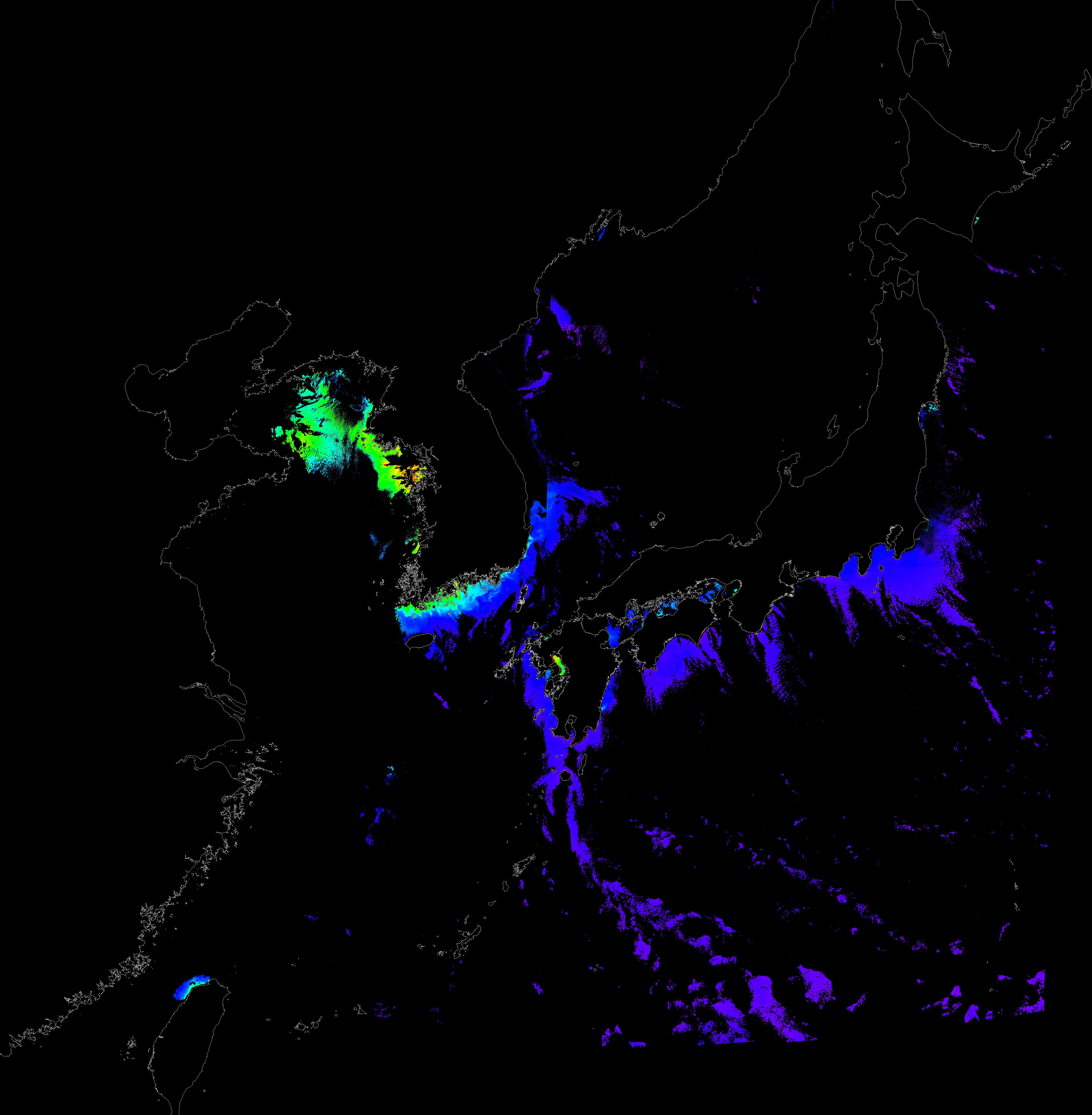 o 2018년 01월 27일 천리안 GOCI 클로로필 a 위성영상입니다. [ GOCI : Geostationary Ocean Color Imager ] o 농도분포는 하단 범례를 참고하시기 바랍니다. o 검은색은 구름을 나타냅니다.