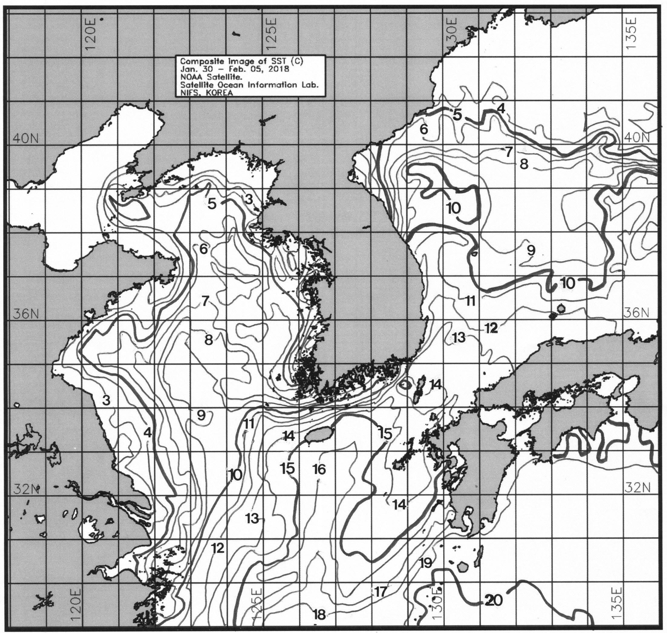 ○ 금주(2018. 1. 30 ~ 2018. 2. 05)의 한국근해 표면수온은 대화퇴 근해 4~6도, 울릉도-독도 근해 9~10도, 대마도 근해 14~15도, 제주도 근해 14~15도, 이어도 근해 13~14도, 가거초 근해 9~11도, 어청도 근해 5~6도, 백령도 근해 3∼4도 로 나타납니다. ○ 「평년에 비해」대화퇴 근해 2.2도 낮게, 울릉도-독도 근해 1.6도 낮게, 대마도 근해 0.5도 낮게, 제주도 근해 비슷하게, 이어도 근해 3.5도 높게, 가거초 근해 비슷하게, 어청도 근해 비슷하게 나타납니다. ○ 「전년에 비해」대화퇴 2.5도 낮게, 울릉도-독도 근해 3.5도 낮게, 대마도 근해 2.5도 낮게, 제주도 근해 2.5도 낮게, 이어도 근해 1도 높게, 가거초 근해 0.5도 높게, 어청도 근해 2도 낮게, 백령도 근해 3.5도 낮게 나타납니다. ○ 수온 전선대는 우리나라 제주해협에서 대한해협까지 13도를 중심으로 형성됩니다.