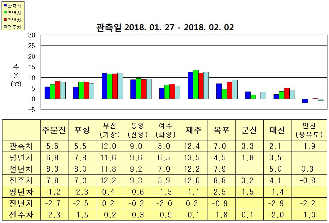 ○ 금주(2018. 01. 27 ~ 2018. 02. 02)의 한반도 연안 표면수온은 동해 연안역에서 섭씨 5.5~12.0도, 남해 연안역 5.0~12.5도, 서해 연안역에서 -2~7도로 나타납니다. ○ 평년에 비해 기장 0.4도 높음을 제외한 동해 연안역은 1.5~2.5도 낮게, 남해 연안역은 0.5~1.5도 낮게, 대천 1.4도 낮음을 제외한 서해 연안역은 1.5~2.5도 높게 나타납니다. ○ 전년에 비해 기장(부산) 비슷함을 제외한 동해 연안역은 2~2.5도 낮게, 통영(산양)과 제주 비슷함을 제외한 남해 연안역은 1.5~2.0도 낮게, 서해 연안역은 2~3도 낮게 나타납니다.