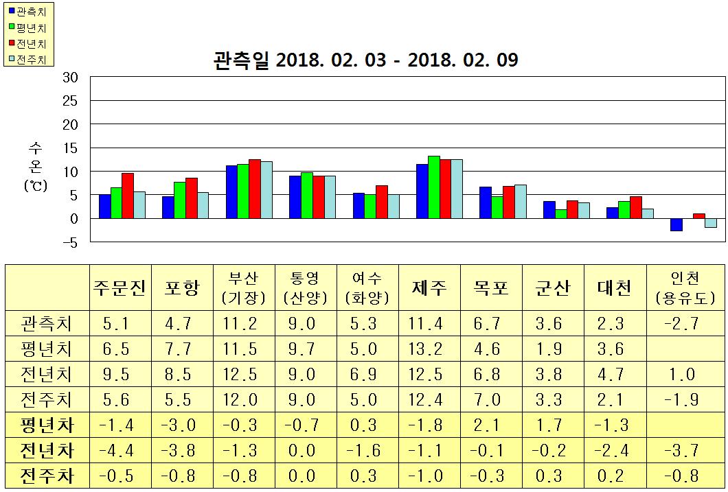 ○ 금주(2018. 01. 20 ~ 2018. 01. 26)의 한반도 연안 표면수온은 동해 연안역에서 섭씨 4.5~11.0도, 남해 연안역 5.0~11.5도, 서해 연안역에서 -2.5~6.5도로 나타납니다. ○ 평년에 비해 기장 비슷함을 제외한 동해 연안역은 1.5~3.0도 낮게, 여수(화양) 비슷함을 제외한 남해 연안역은 0.5~2.0도 낮게, 대천 1.3도 낮음을 제외한 서해 연안역은 1.5~2.0도 높게 나타납니다. ○ 전년에 비해 동해 연안역은 1.0~4.5도 낮게, 통영(산양) 비슷함을 제외한 남해 연안역은 1.0~1.5도 낮게, 목포와 군산 비슷함을 제외한 서해 연안역은 2.5~3.5도 낮게 나타납니다.