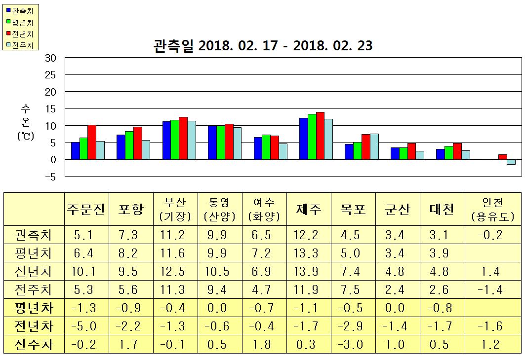 ○ 금주(2018. 02. 17 ~ 2018. 02. 23)의 한반도 연안 표면수온은 동해 연안역에서 섭씨 5~11도, 남해 연안역 6.5~12.0도, 서해 연안역에서 -0.5~4.5도로 나타납니다. ○ 평년에 비해 동해 연안역은 0.5~1.5도 낮게, 통영(산양) 비슷함을 제외한 남해 연안역은 0.5~1.0도 낮게, 군산 비슷함을 제외한 서해 연안역은 0.5~1.0도 낮게 나타납니다. ○ 전년에 비해 동해 연안역은 1.5~5.0도 낮게, 남해 연안역은 0.5~2.0도 낮게, 서해 연안역은 1.5~3.0도 낮게 나타납니다.