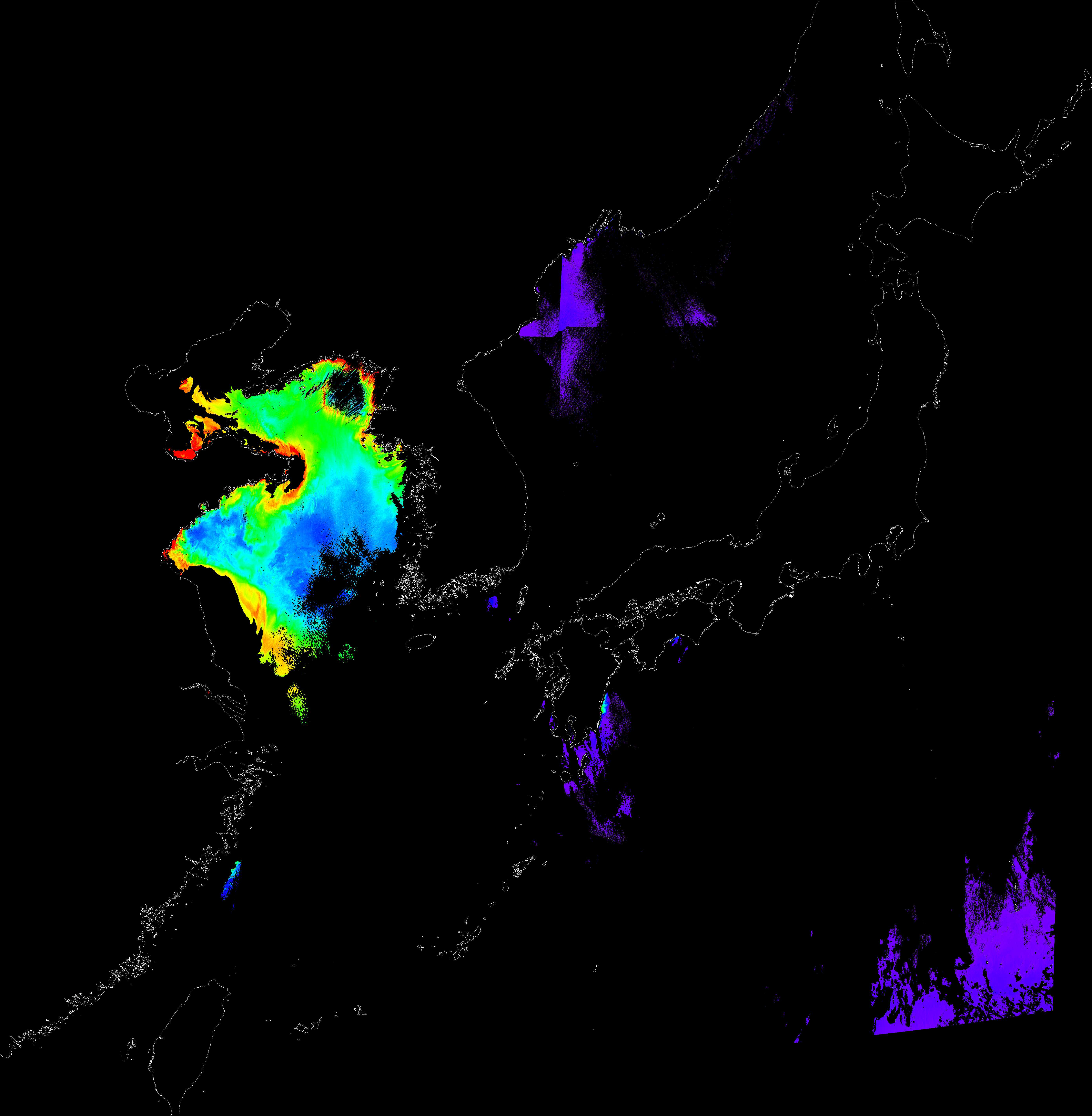 o 2018년 03월 09일 천리안 GOCI 클로로필 a 위성영상입니다. [ GOCI : Geostationary Ocean Color Imager ] o 농도분포는 하단 범례를 참고하시기 바랍니다. o 검은색은 구름을 나타냅니다.