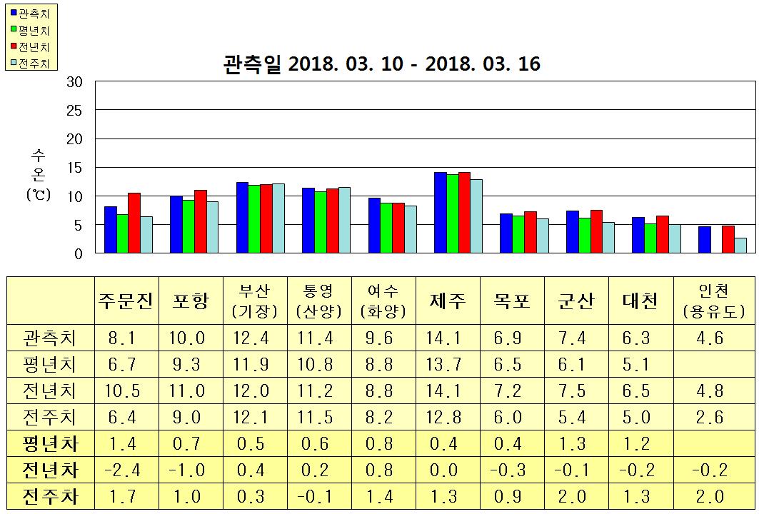 ○ 금주(2018. 03. 10 ~ 2018. 03. 16)의 한반도 연안 표면수온은 동해 연안역에서 섭씨 8.0~12.5도, 남해 연안역 9.5~14.0도, 서해 연안역에서 4.5~7.5도로 나타납니다. ○ 평년에 비해 동해 연안역은 0.5~1.5도 높게, 남해 연안역은 0.5~1.0도 높게, 서해 연안역은 0.5~1.5도 높게 나타납니다. ○ 전년에 비해 기장 0.5~1.0도 높음을 제외한 동해 연안역은 1.0~2.5도 낮게, 여수(화양) 0.5~1.0도 높음을 제외한 남해 연안역은 비슷하게, 서해 연안역은 비슷하게 나타납니다.