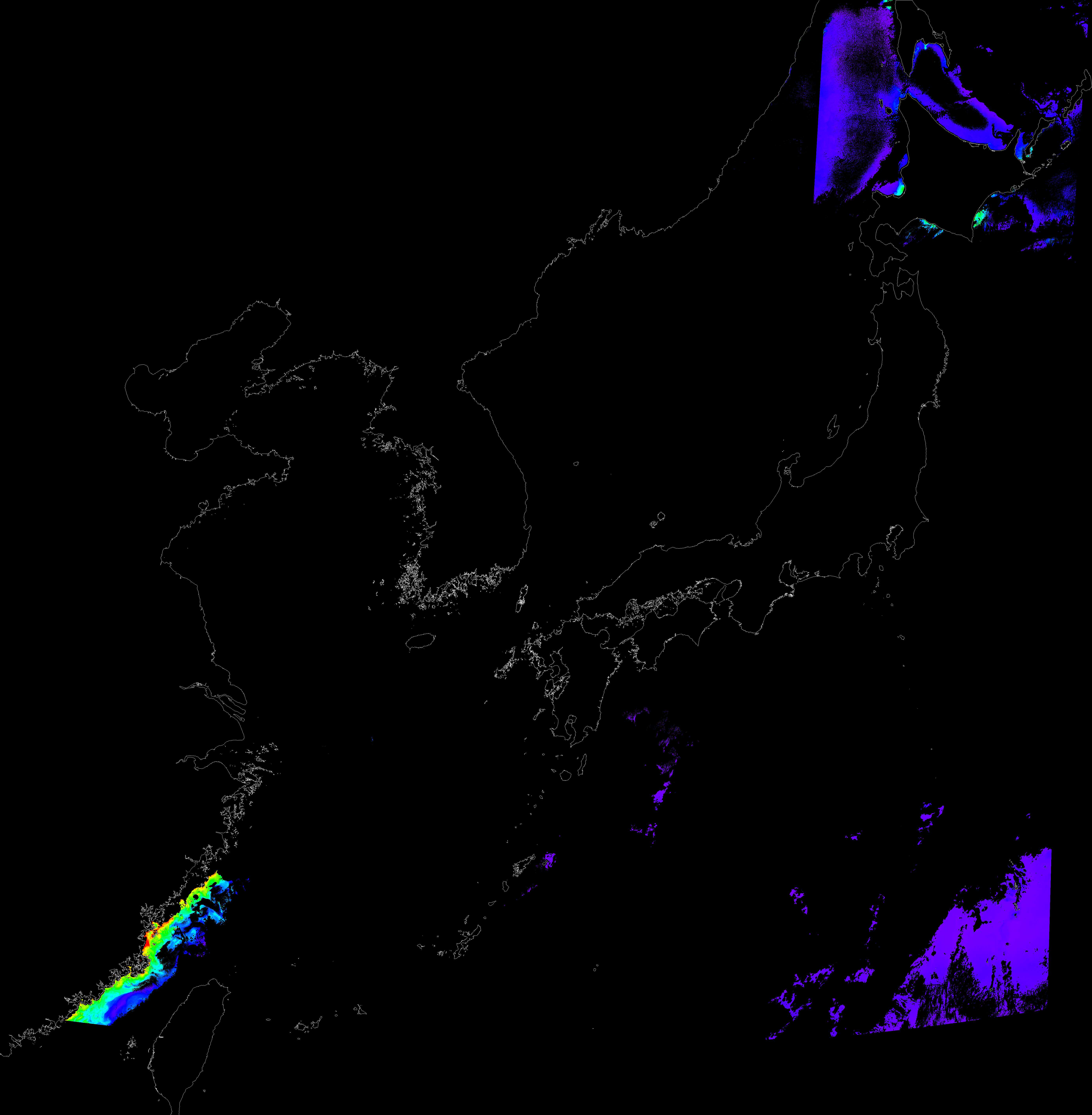 o 2018년 03월 21일 천리안 GOCI 클로로필 a 위성영상입니다. [ GOCI : Geostationary Ocean Color Imager ] o 농도분포는 하단 범례를 참고하시기 바랍니다. o 검은색은 구름을 나타냅니다.