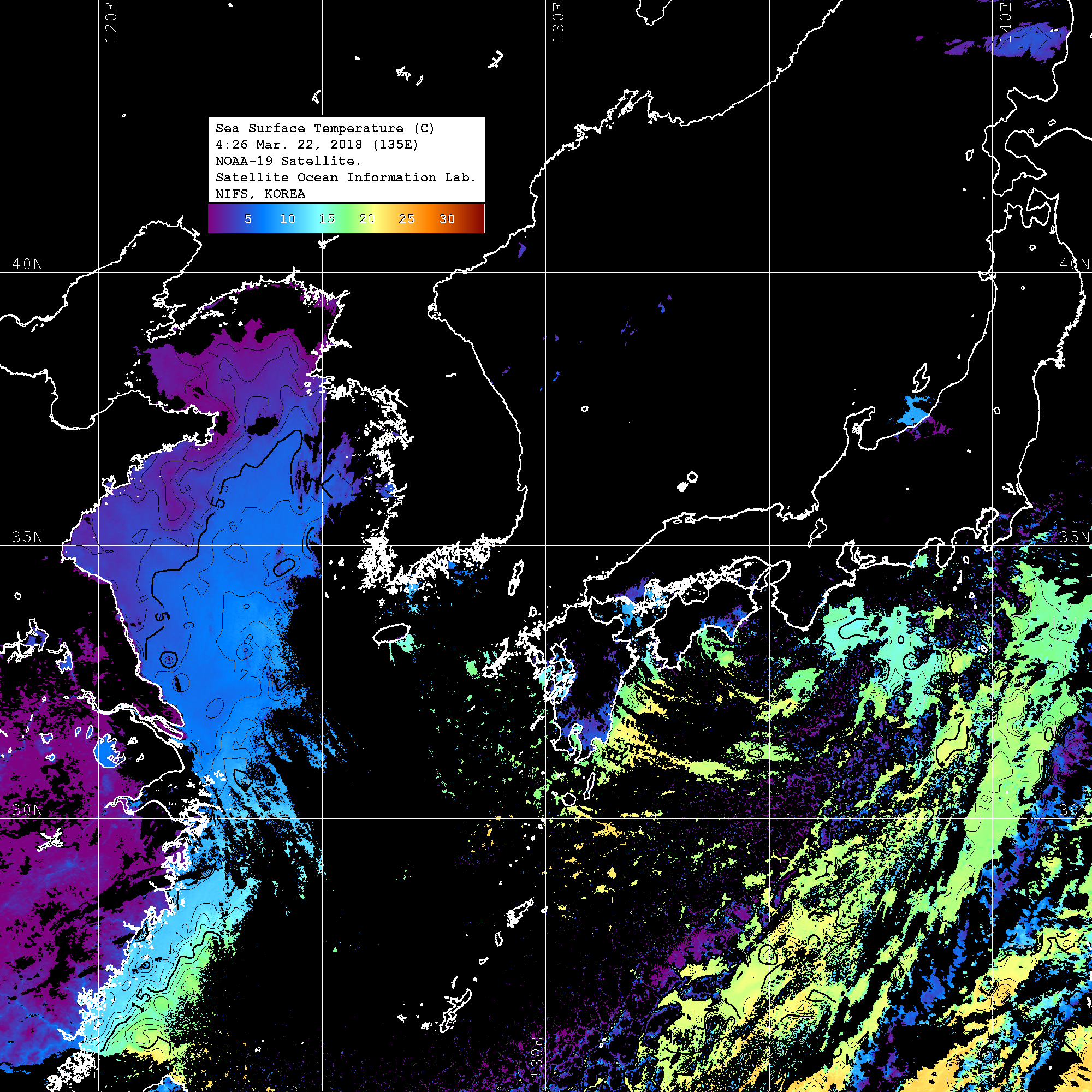 o 2018 년 03 월 22 일 NOAA 위성영상입니다. o 영상 시간 및 수온분포는 범례를 참고하시기 바랍니다. o 검은색은 구름을 나타냅니다. o 그림을 클릭하시면 크게 보실 수 있습니다.