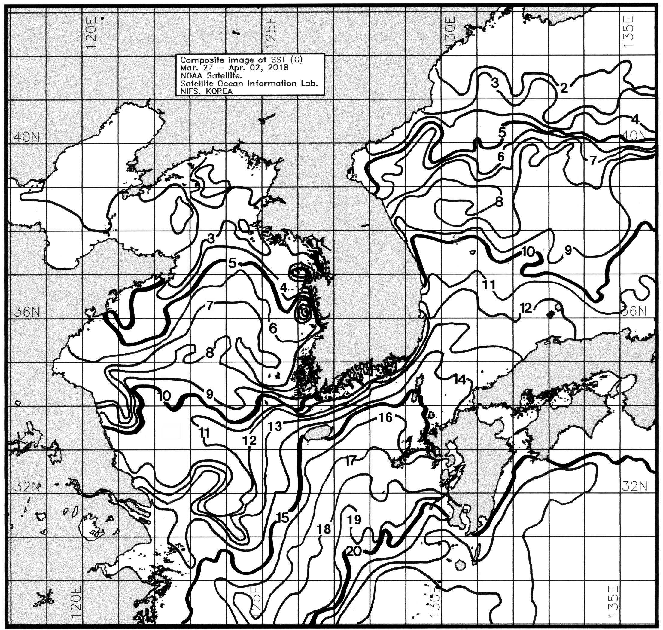 ○ 금주(2018. 03. 27 ~ 2018. 04. 02)의 한국근해 표면수온은 대화퇴 근해 7~9도, 울릉도-독도 근해 10~11도, 대마도 근해 14~16도, 제주도 근해 14~16도, 이어도 근해 12~14도, 가거초 근해 10~11, 어청도 근해 5~6도, 백령도 근해 4∼6도 로 나타납니다. ○ 「평년에 비해」대화퇴 근해 0.7도 높게, 울릉도-독도 근해 비슷하게, 대마도 근해 0.4도 높게, 제주도 근해 0.7도 높게, 이어도 근해 2.9도 높게, 가거초 근해 1.2도 높게, 어청도 근해 0.8도 낮게 나타납니다. ○ 「전년에 비해」대화퇴 2도 낮게, 울릉도-독도 근해 1도 낮게, 대마도 근해 0.5도 낮게, 제주도 근해 비슷하게, 이어도 근해 2.5도 높게, 가거초 근해 1도 높게, 어청도 근해 1도 낮게, 백령도 근해 0.5도 낮게 나타납니다. ○ 수온 전선대는 우리나라 제주해협에서 대한해협까지 14도를 중심으로 형성됩니다.