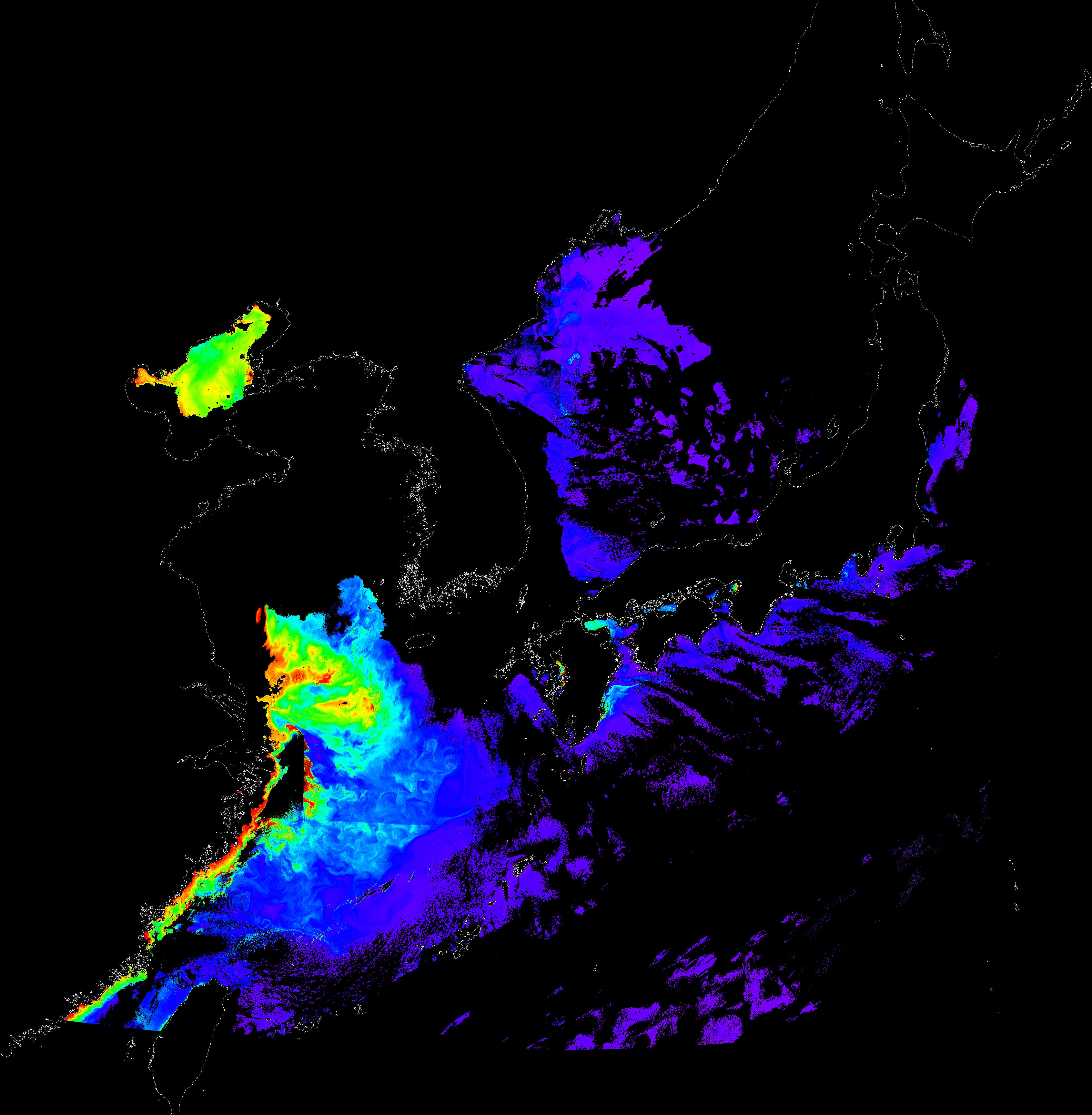 o 2018년 04월 08일 천리안 GOCI 클로로필 a 위성영상입니다. [ GOCI : Geostationary Ocean Color Imager ] o 농도분포는 하단 범례를 참고하시기 바랍니다. o 검은색은 구름을 나타냅니다.