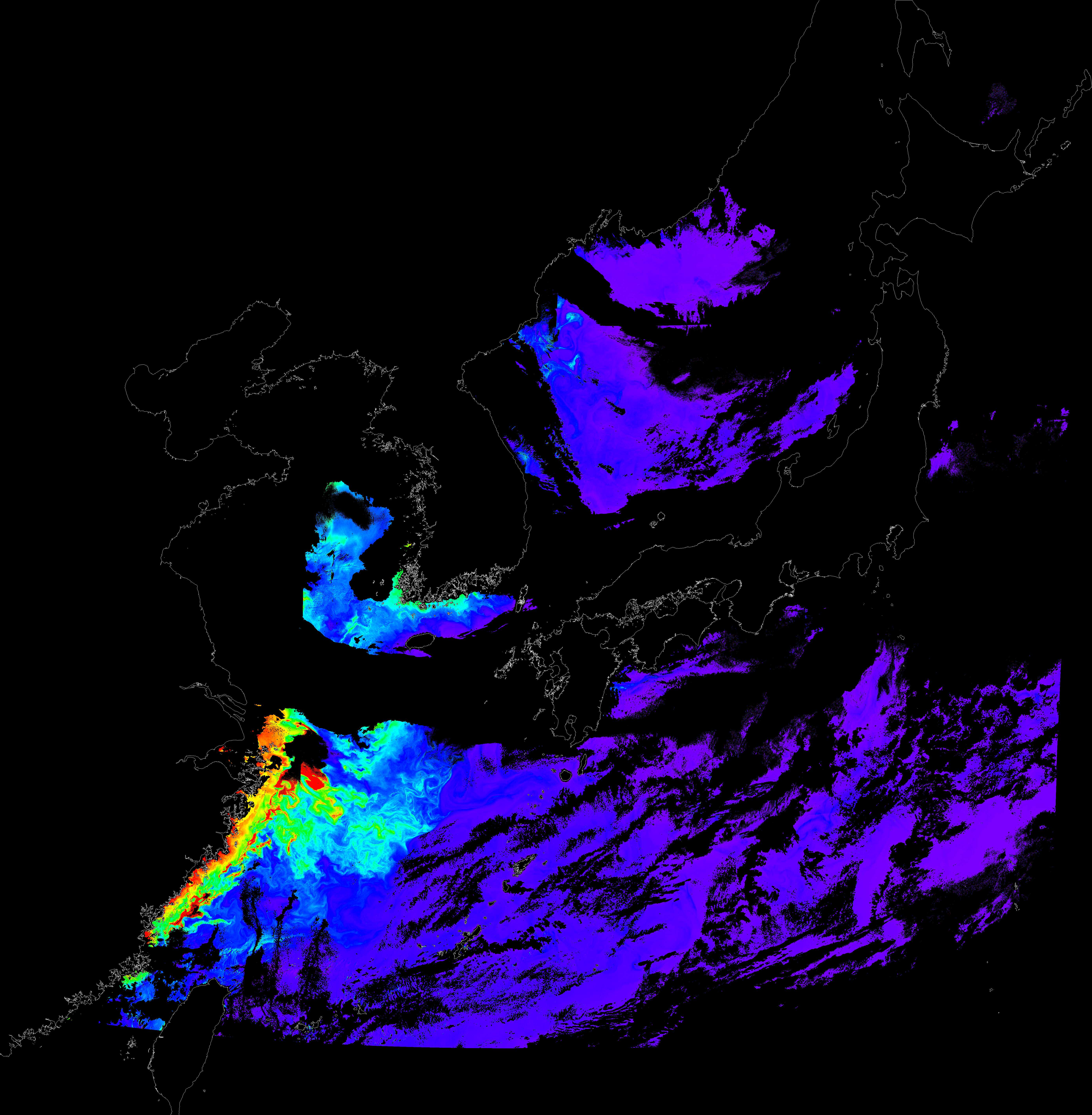 o 2018년 04월 09일 천리안 GOCI 클로로필 a 위성영상입니다. [ GOCI : Geostationary Ocean Color Imager ] o 농도분포는 하단 범례를 참고하시기 바랍니다. o 검은색은 구름을 나타냅니다.