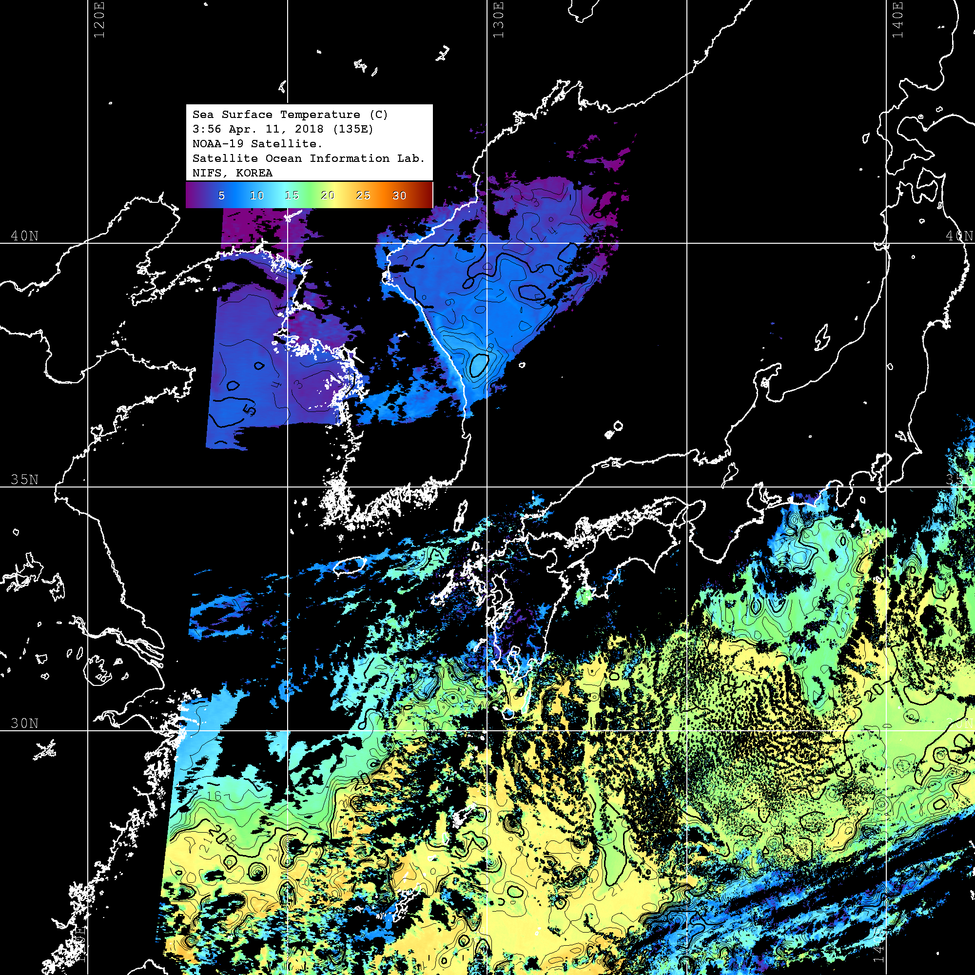 o 2018 년 04 월 11 일 NOAA 위성영상입니다. o 영상 시간 및 수온분포는 범례를 참고하시기 바랍니다. o 검은색은 구름을 나타냅니다. o 그림을 클릭하시면 크게 보실 수 있습니다.