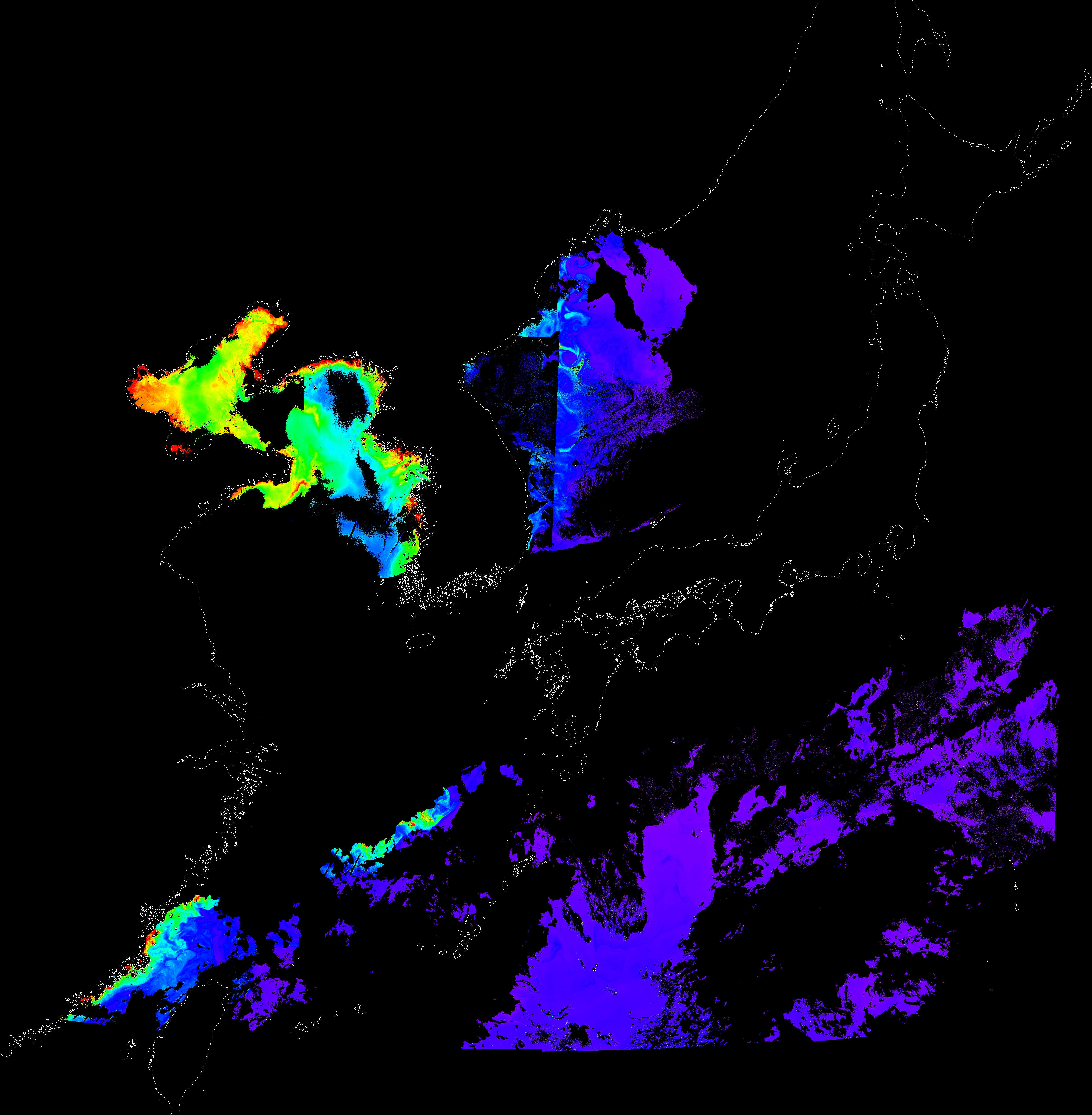 o 2018년 04월 11일 천리안 GOCI 클로로필 a 위성영상입니다. [ GOCI : Geostationary Ocean Color Imager ] o 농도분포는 하단 범례를 참고하시기 바랍니다. o 검은색은 구름을 나타냅니다.