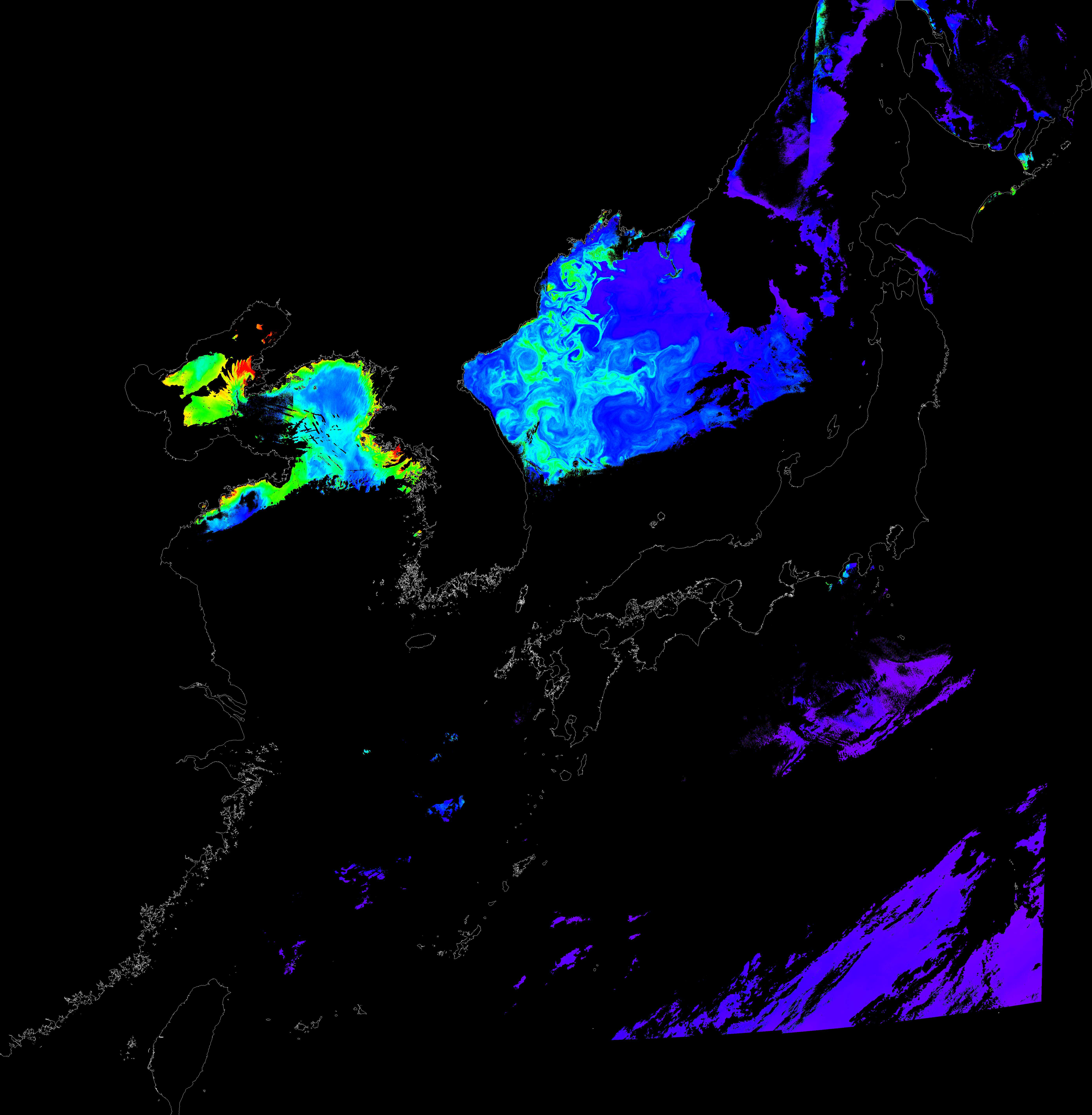 o 2018년 04월 16일 천리안 GOCI 클로로필 a 위성영상입니다. [ GOCI : Geostationary Ocean Color Imager ] o 농도분포는 하단 범례를 참고하시기 바랍니다. o 검은색은 구름을 나타냅니다.