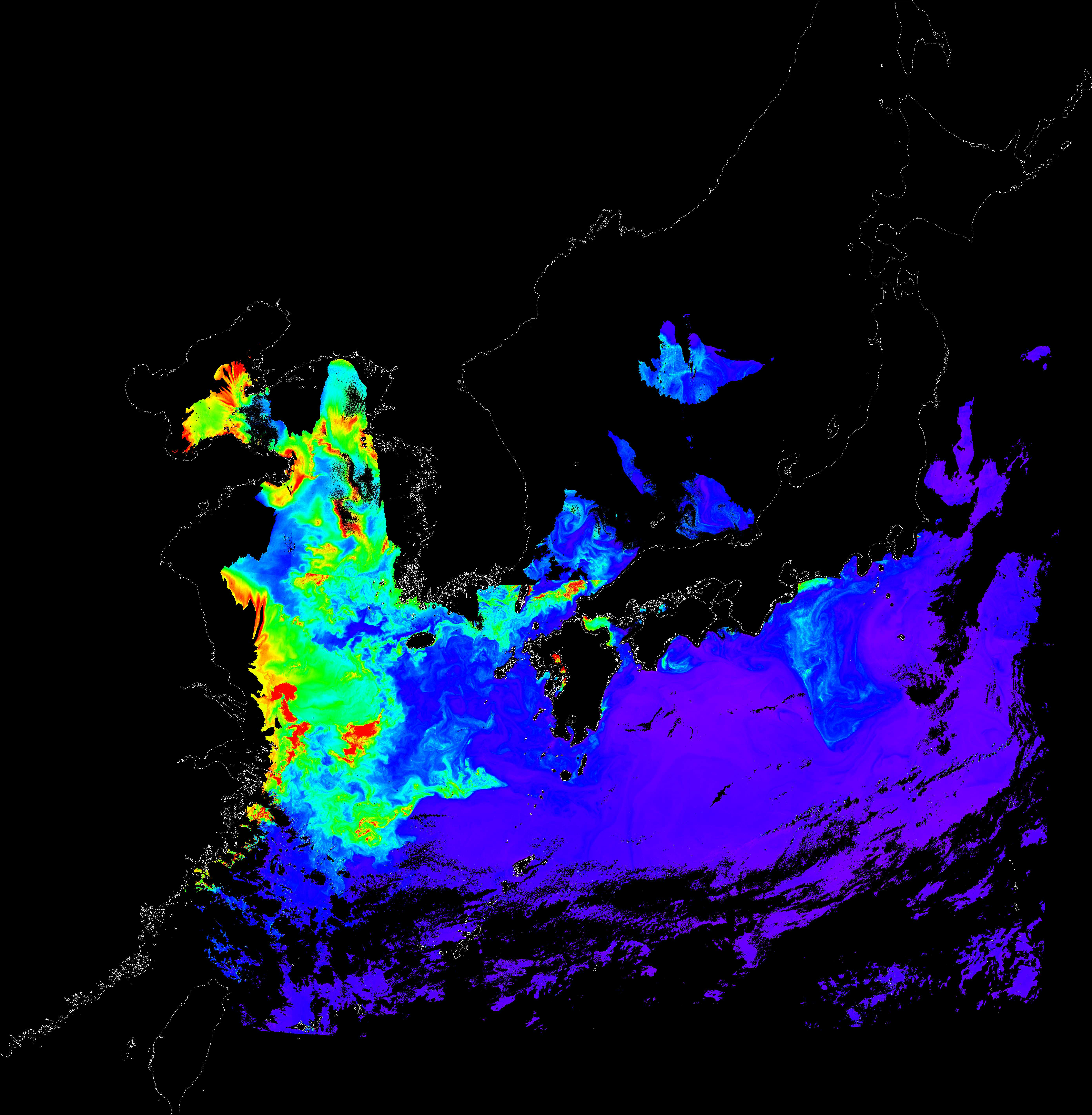 o 2018년 04월 20일 천리안 GOCI 클로로필 a 위성영상입니다. [ GOCI : Geostationary Ocean Color Imager ] o 농도분포는 하단 범례를 참고하시기 바랍니다. o 검은색은 구름을 나타냅니다.