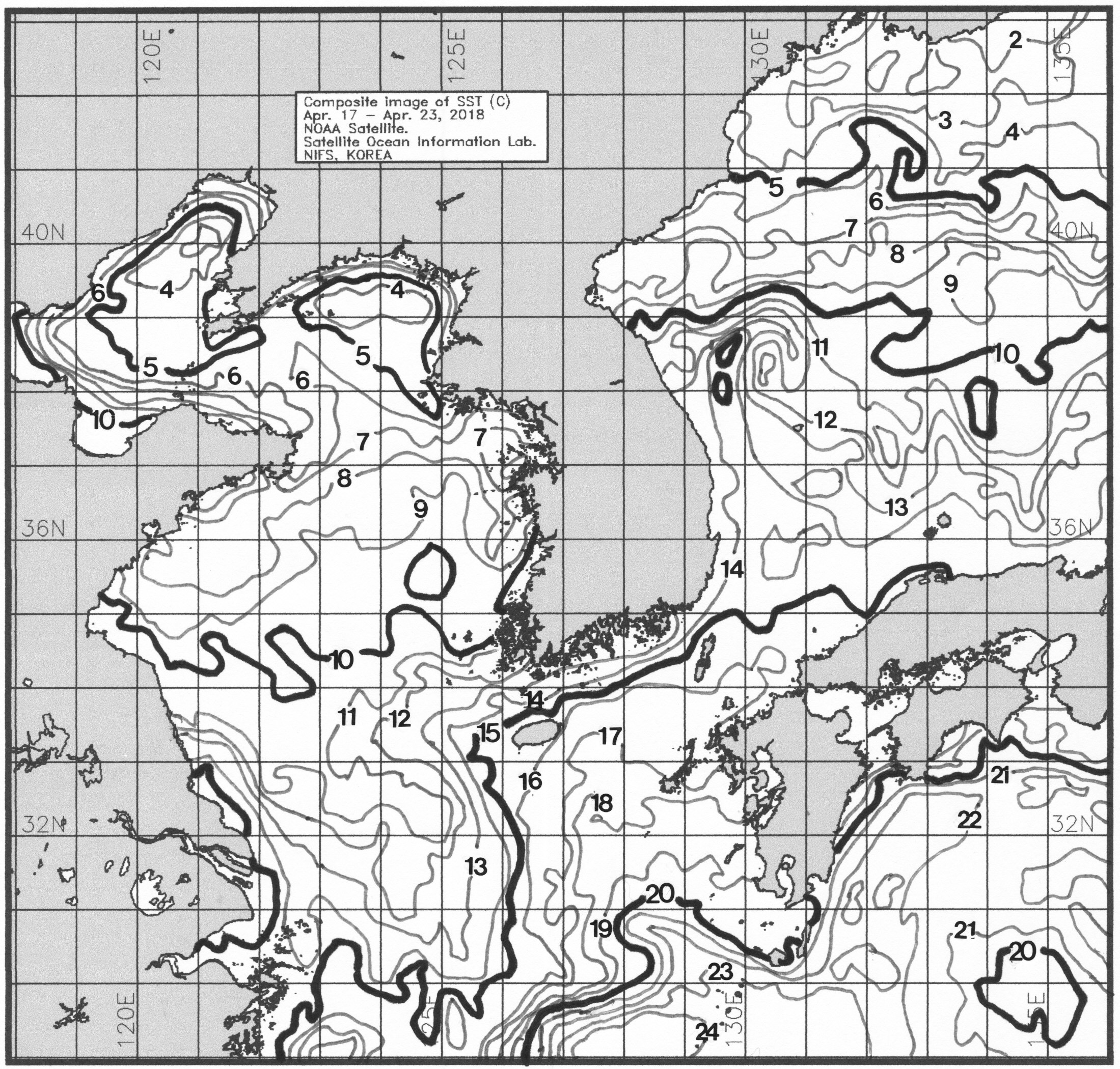 ○ 금주(2018. 04. 17 ~ 2018. 04. 23)의 한국근해 표면수온은 대화퇴 근해 8~9도, 울릉도-독도 근해 12~13도, 대마도 근해 15~16도, 제주도 근해 15~16도, 이어도 근해 11~12도, 가거초 근해 12~13, 어청도 근해 6~8도, 백령도 근해 6∼7도 로 나타납니다. ○ 「평년에 비해」대화퇴 근해 0.7도 낮게, 울릉도-독도 근해 비슷하게, 대마도 근해 비슷하게, 제주도 근해 0.5도 높게, 이어도 근해 0.9도 낮게, 가거초 근해 1.7도 높게, 어청도 근해 1.7도 낮게 나타납니다. ○ 「전년에 비해」대화퇴 2.5도 낮게, 울릉도-독도 근해 비슷하게, 대마도 근해 1도 낮게, 제주도 근해 0.5도 높게, 이어도 근해 0.5도 낮게, 가거초 근해 2도 높게, 어청도 근해 2.5도 낮게, 백령도 근해 1도 낮게 나타납니다. ○ 수온 전선대는 우리나라 제주해협에서 대한해협까지 14도를 중심으로 형성됩니다.