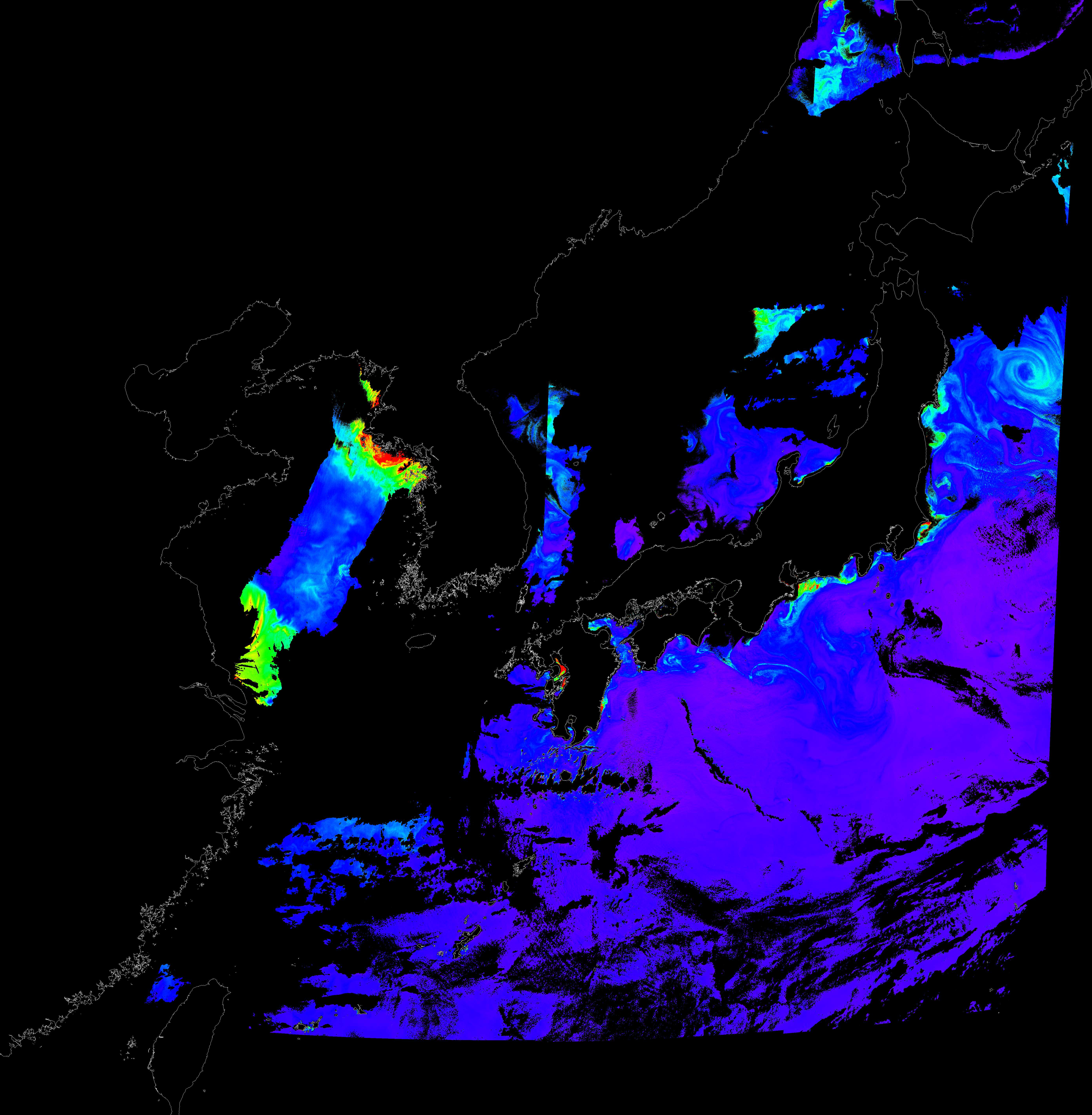 o 2018년 04월 28일 천리안 GOCI 클로로필 a 위성영상입니다. [ GOCI : Geostationary Ocean Color Imager ] o 농도분포는 하단 범례를 참고하시기 바랍니다. o 검은색은 구름을 나타냅니다.