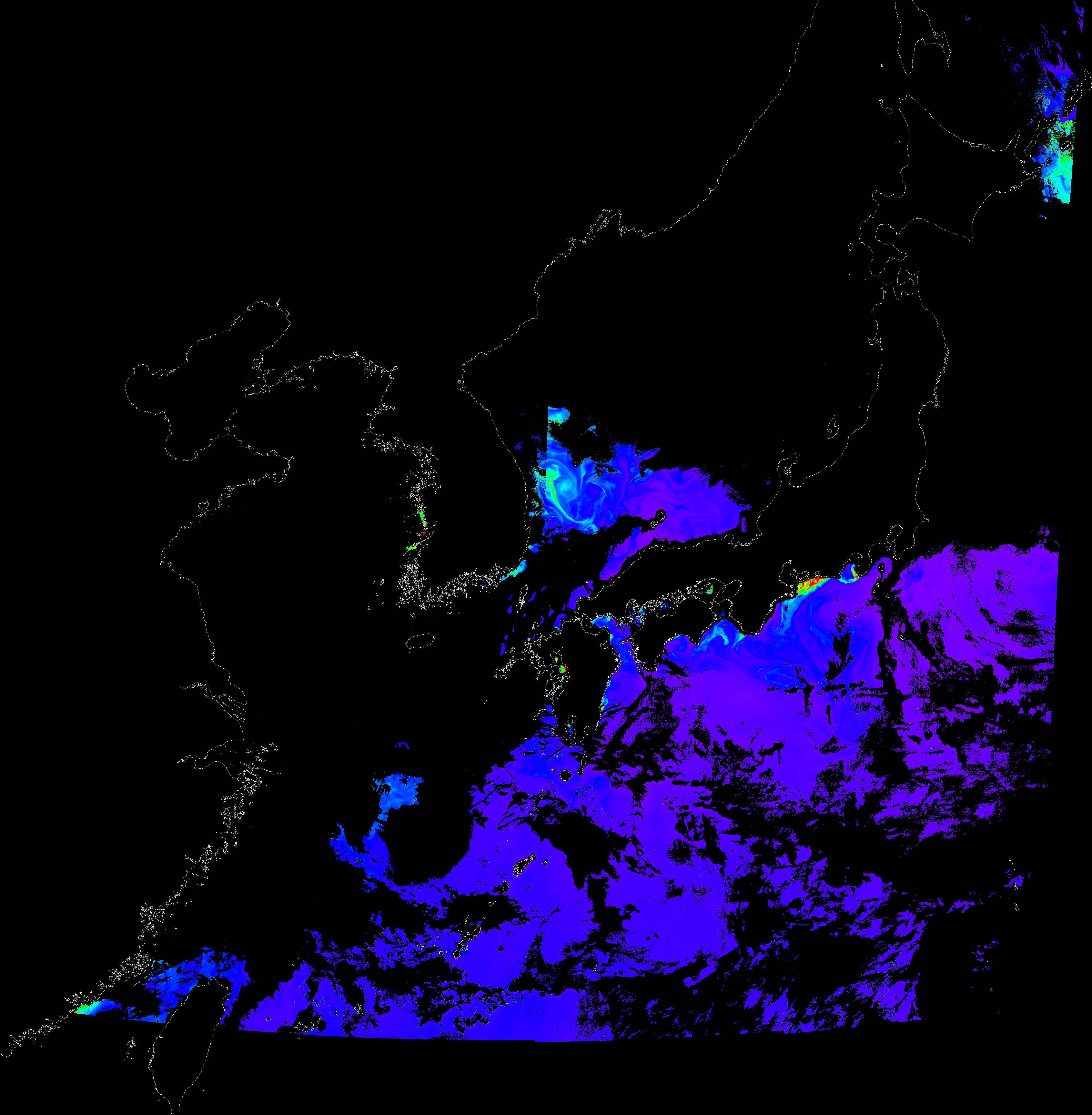 o 2018년 04월 29일 천리안 GOCI 클로로필 a 위성영상입니다. [ GOCI : Geostationary Ocean Color Imager ] o 농도분포는 하단 범례를 참고하시기 바랍니다. o 검은색은 구름을 나타냅니다.