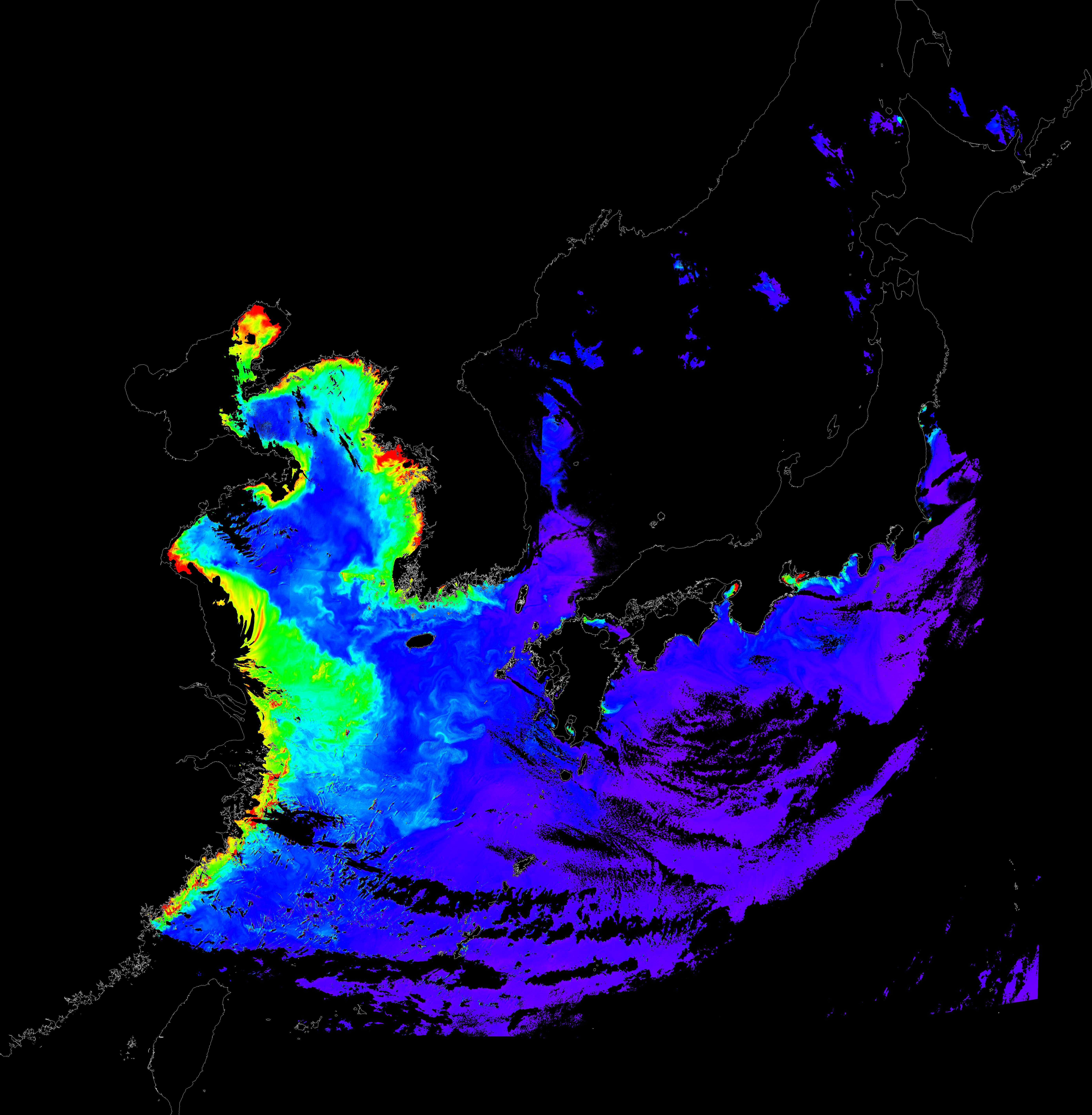 o 2018년 05월 04일 천리안 GOCI 클로로필 a 위성영상입니다. [ GOCI : Geostationary Ocean Color Imager ] o 농도분포는 하단 범례를 참고하시기 바랍니다. o 검은색은 구름을 나타냅니다.