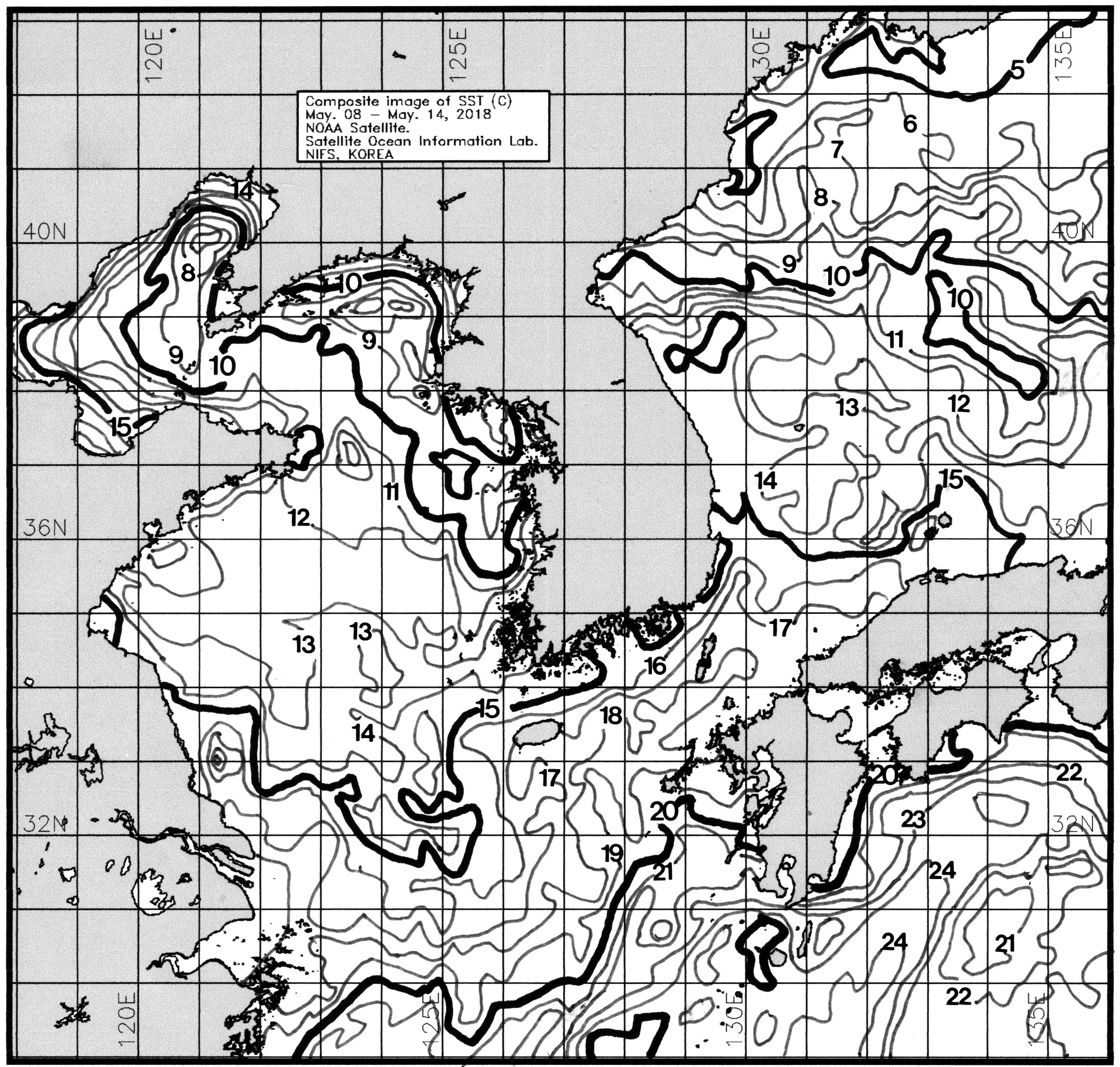 ○ 금주(2018. 05. 08 ~ 2018. 05. 14)의 한국근해 표면수온은 대화퇴 근해 8~9도, 울릉도-독도 근해 13~14도, 대마도 근해 17~18도, 제주도 근해 16~18도, 이어도 근해 14~15도, 가거초 근해 13~15, 어청도 근해 9~10도, 백령도 근해 8∼9도 로 나타납니다. ○ 「평년에 비해」대화퇴 근해 3.6도 낮게, 울릉도-독도 근해 1.1도 낮게, 대마도 근해 비슷하게, 제주도 근해 0.4도 높게, 이어도 근해 1.1도 낮게, 가거초 근해 비슷하게, 어청도 근해 2.5도 낮게 나타납니다. ○ 「전년에 비해」대화퇴 4.5도 낮게, 울릉도-독도 근해 2도 낮게, 대마도 근해 0.5도 높게, 제주도 근해 1도 높게, 이어도 근해 0.5도 낮게, 가거초 근해 0.5도 높게, 어청도 근해 2도 낮게, 백령도 근해 2도 낮게 나타납니다. ○ 수온 전선대는 우리나라 제주해협에서 대한해협까지 15도를 중심으로 형성됩니다.