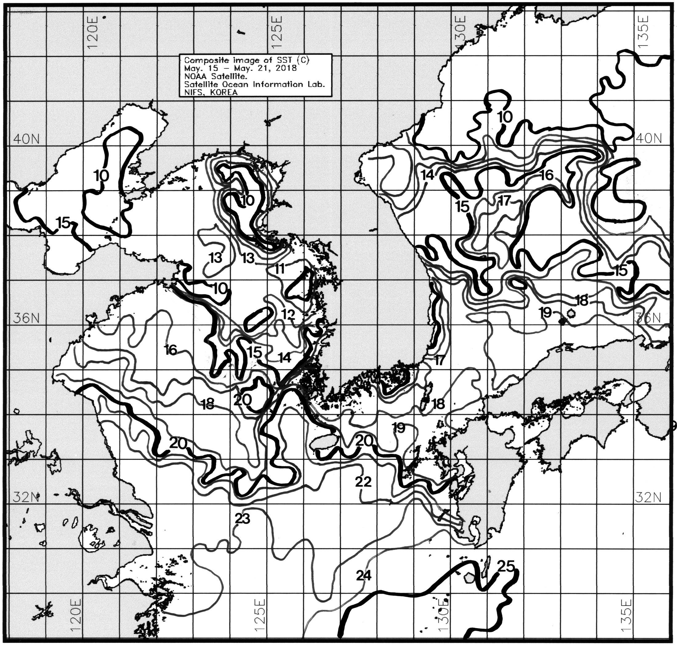 ○ 금주(2018. 05. 15 ~ 2018. 05. 21)의 한국근해 표면수온은 대화퇴 근해 9~10도, 울릉도-독도 근해 15~16도, 대마도 근해 17~18도, 제주도 근해 19~20도, 이어도 근해 22~23도, 가거초 근해 19~20, 어청도 근해 12~13도, 백령도 근해 9∼10도 로 나타납니다. ○ 「평년에 비해」대화퇴 근해 2.5도 낮게, 울릉도-독도 근해 0.8도 높게, 대마도 근해 비슷하게, 제주도 근해 2.8도 높게, 이어도 근해 6.6도 높게, 가거초 근해 5.4도 높게, 어청도 근해 0.5도 낮게 나타납니다. ○ 「전년에 비해」대화퇴 4.5도 낮게, 울릉도-독도 근해 1도 낮게, 대마도 근해 1도 낮게, 제주도 근해 0.5도 높게, 이어도 근해 3도 높게, 가거초 근해 4.5도 높게, 어청도 근해 4도 낮게, 백령도 근해 4도 낮게 나타납니다. ○ 수온 전선대는 우리나라 제주해협에서 대한해협까지 18도를 중심으로 형성됩니다.