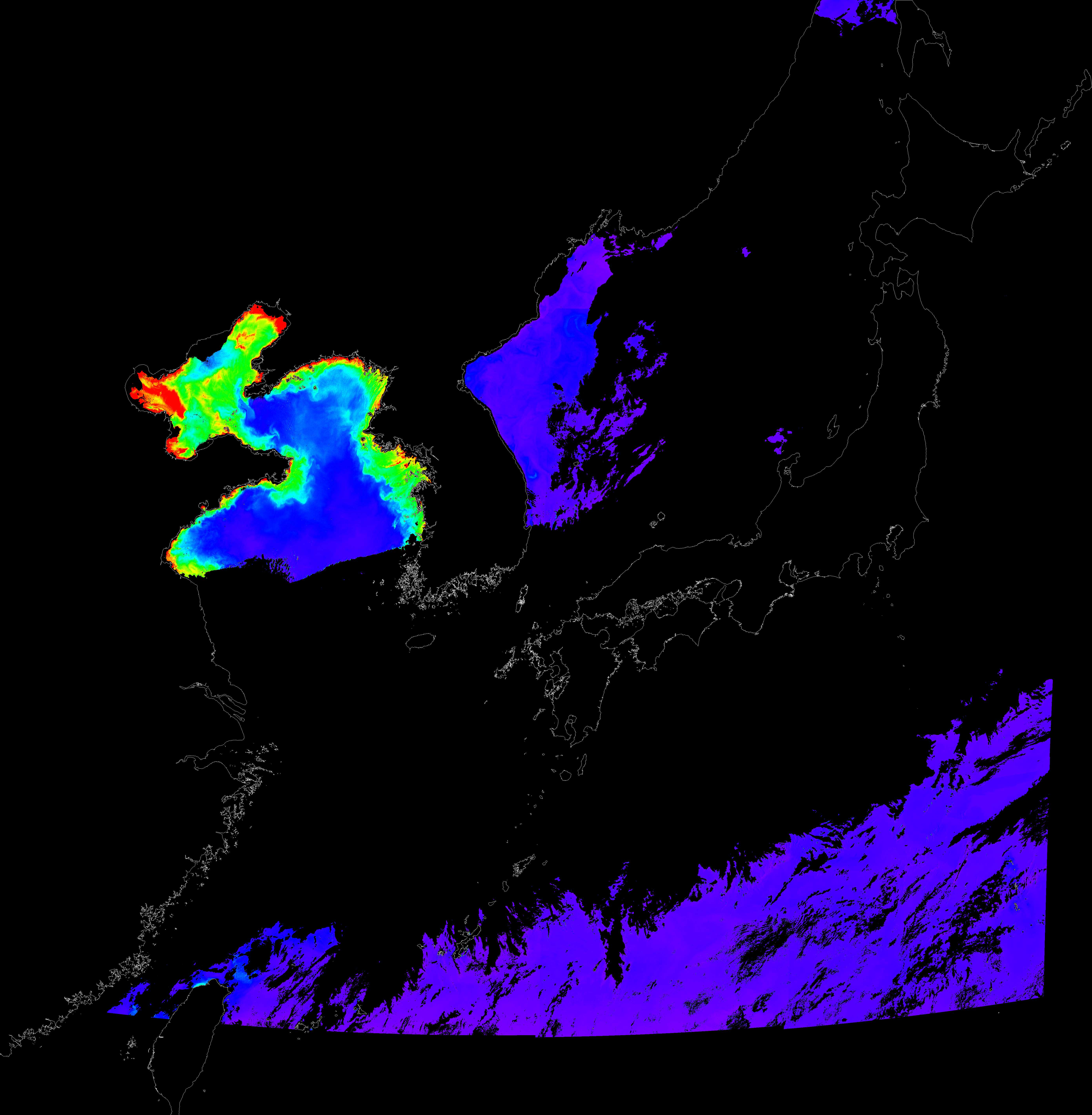 o 2018년 05월 31일 천리안 GOCI 클로로필 a 위성영상입니다. [ GOCI : Geostationary Ocean Color Imager ] o 농도분포는 하단 범례를 참고하시기 바랍니다. o 검은색은 구름을 나타냅니다.