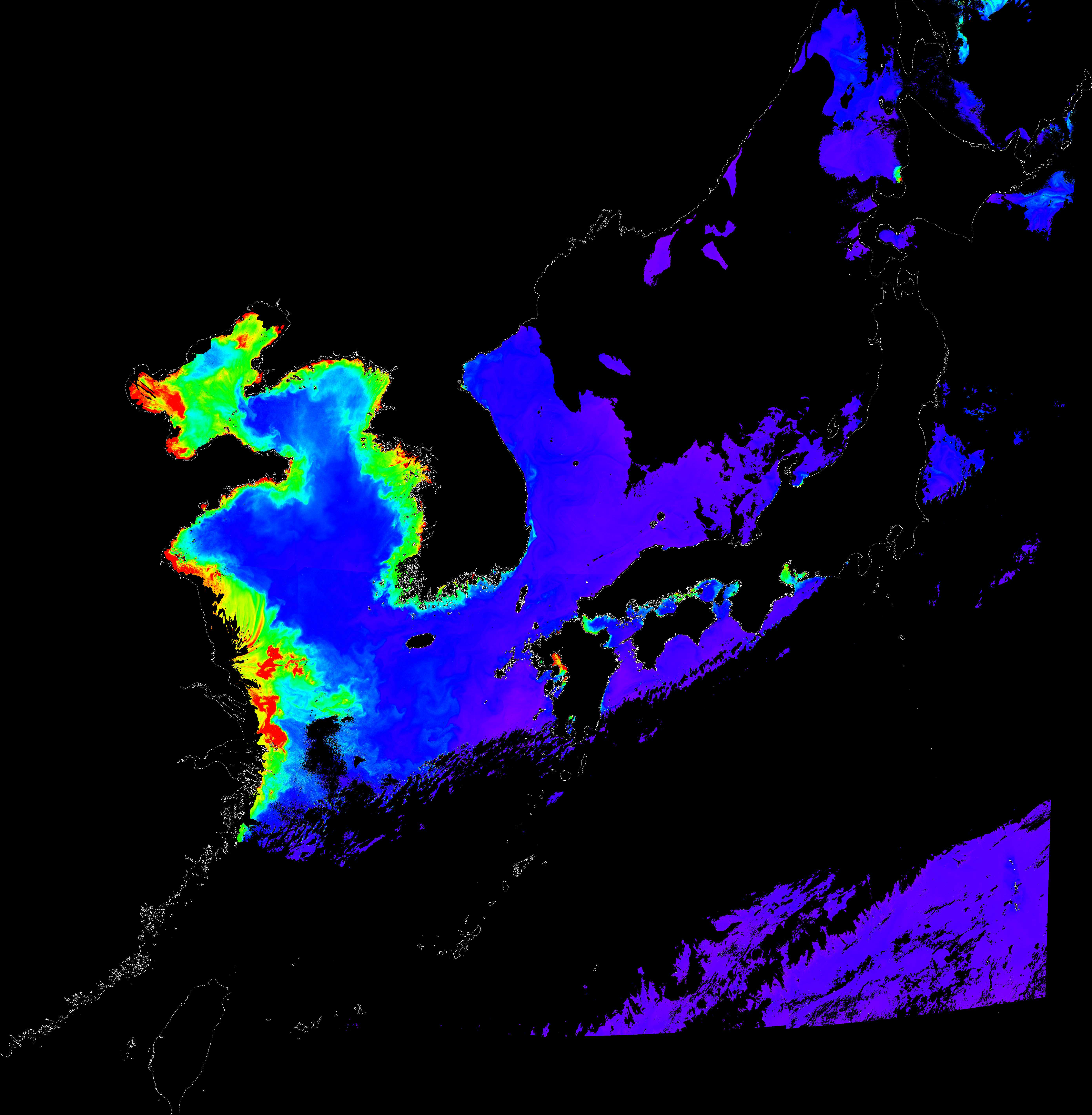 o 2018년 06월 01일 천리안 GOCI 클로로필 a 위성영상입니다. [ GOCI : Geostationary Ocean Color Imager ] o 농도분포는 하단 범례를 참고하시기 바랍니다. o 검은색은 구름을 나타냅니다.