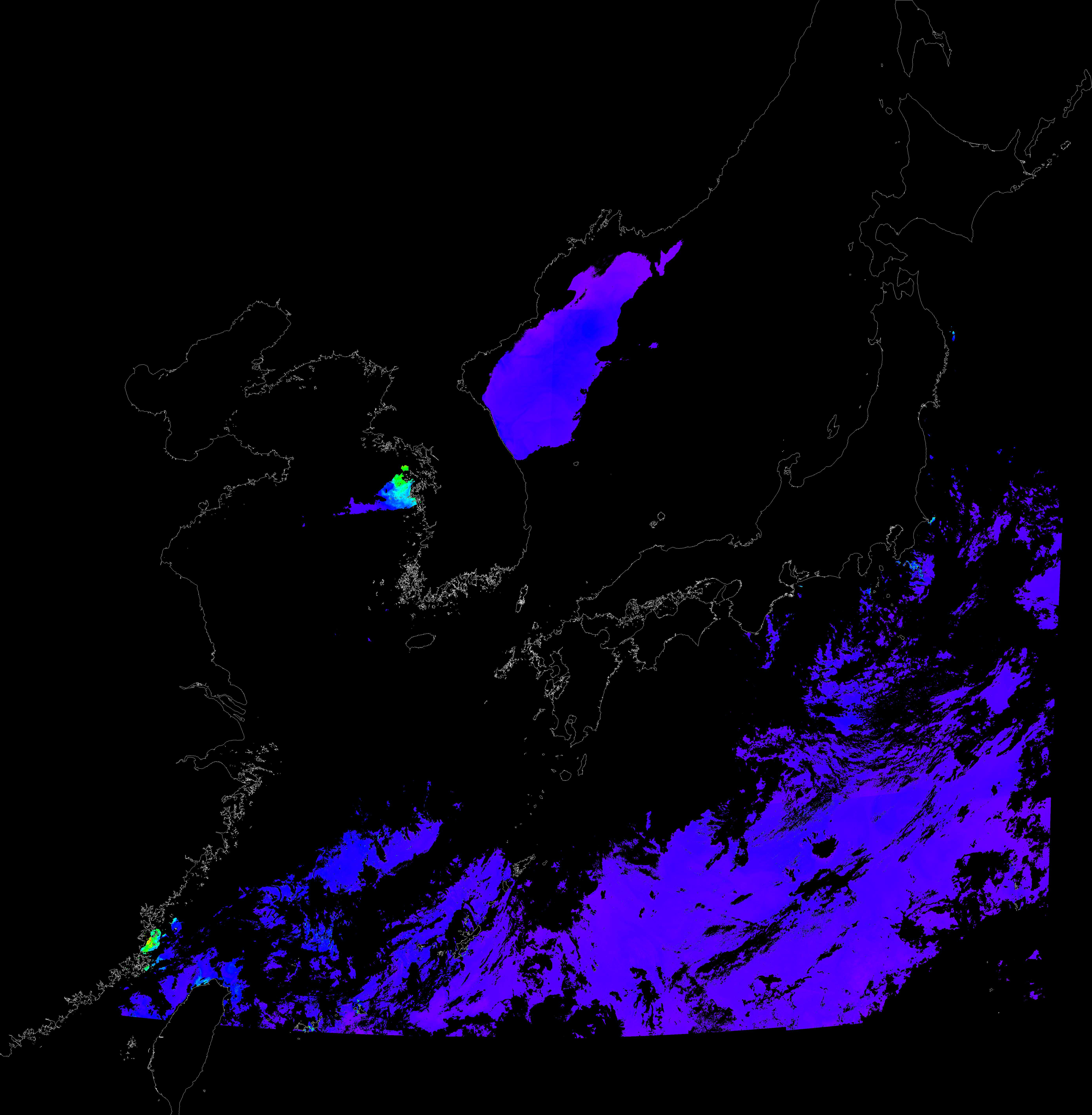 o 2018년 06월 05일 천리안 GOCI 클로로필 a 위성영상입니다. [ GOCI : Geostationary Ocean Color Imager ] o 농도분포는 하단 범례를 참고하시기 바랍니다. o 검은색은 구름을 나타냅니다.