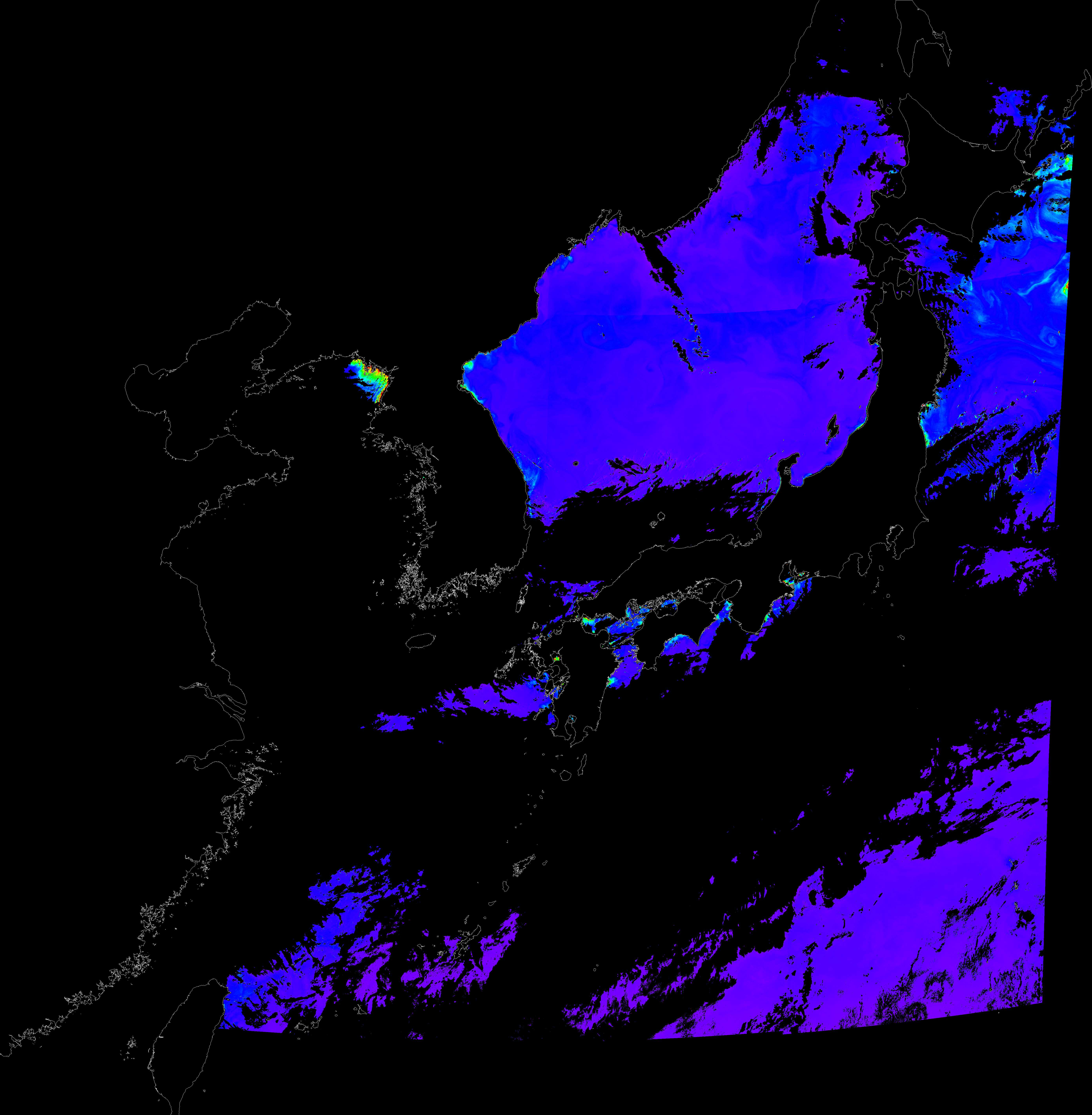 o 2018년 06월 22일 천리안 GOCI 클로로필 a 위성영상입니다. [ GOCI : Geostationary Ocean Color Imager ] o 농도분포는 하단 범례를 참고하시기 바랍니다. o 검은색은 구름을 나타냅니다.