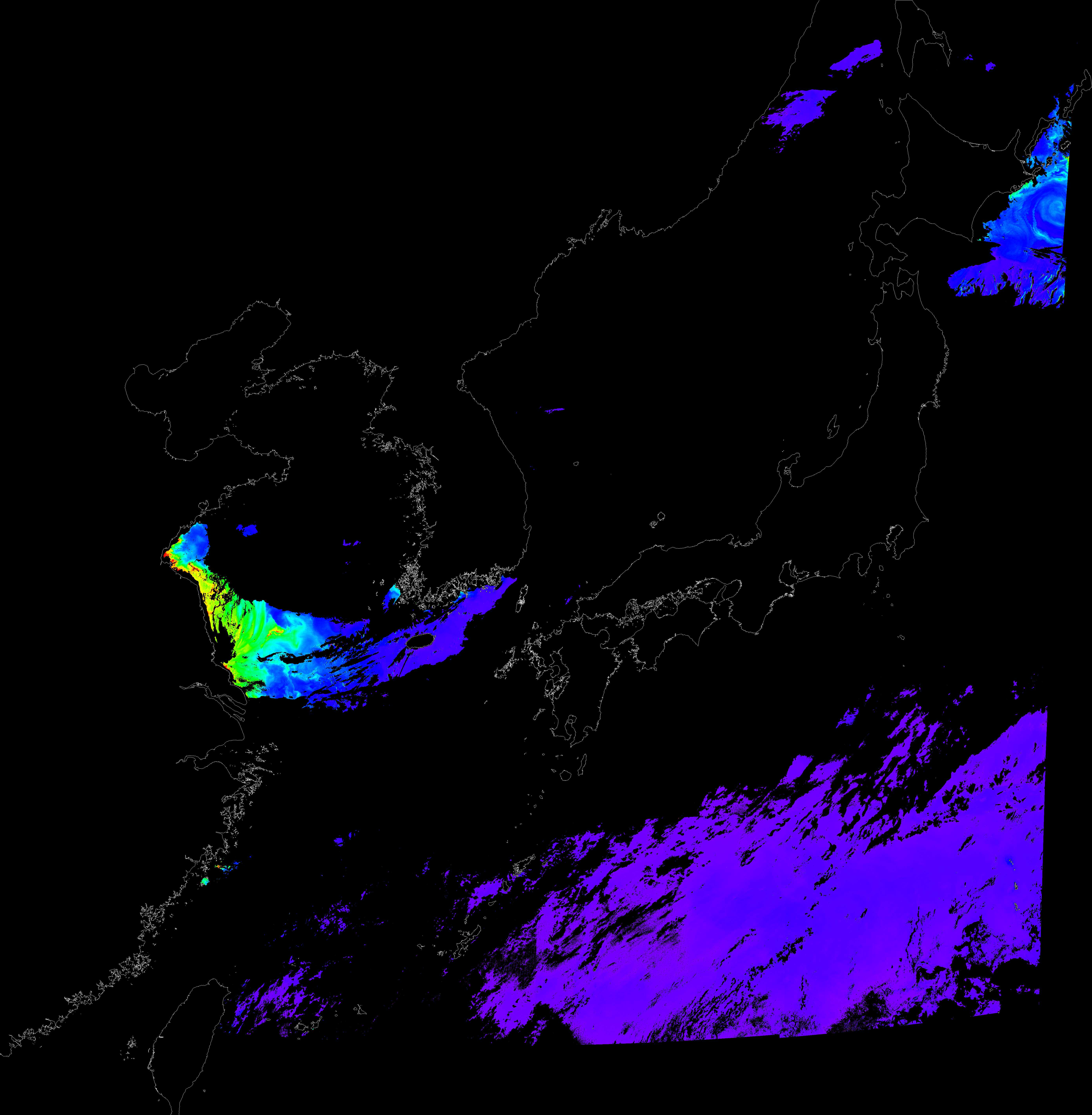 o 2018년 06월 23일 천리안 GOCI 클로로필 a 위성영상입니다. [ GOCI : Geostationary Ocean Color Imager ] o 농도분포는 하단 범례를 참고하시기 바랍니다. o 검은색은 구름을 나타냅니다.
