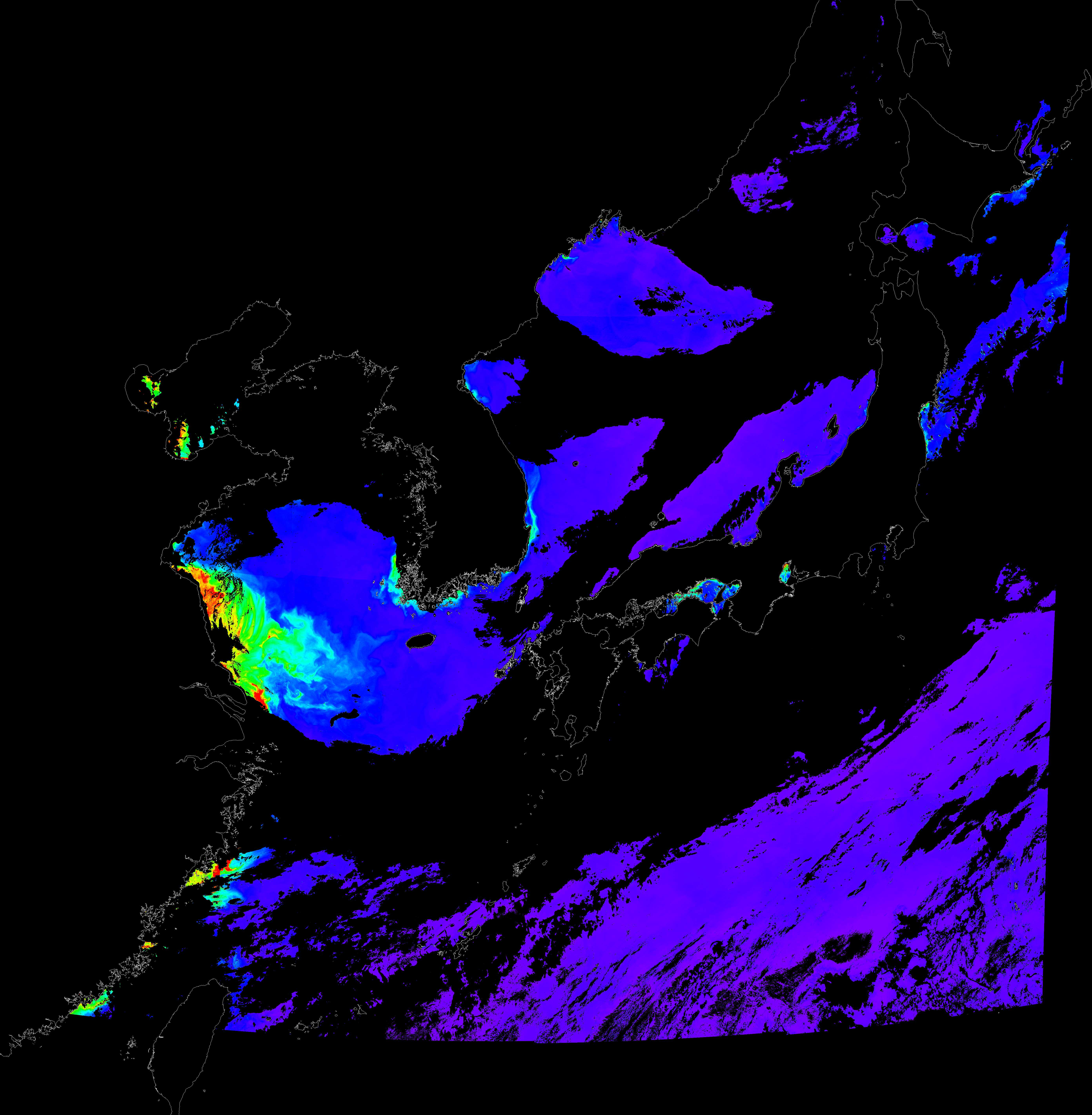 o 2018년 06월 24일 천리안 GOCI 클로로필 a 위성영상입니다. [ GOCI : Geostationary Ocean Color Imager ] o 농도분포는 하단 범례를 참고하시기 바랍니다. o 검은색은 구름을 나타냅니다.