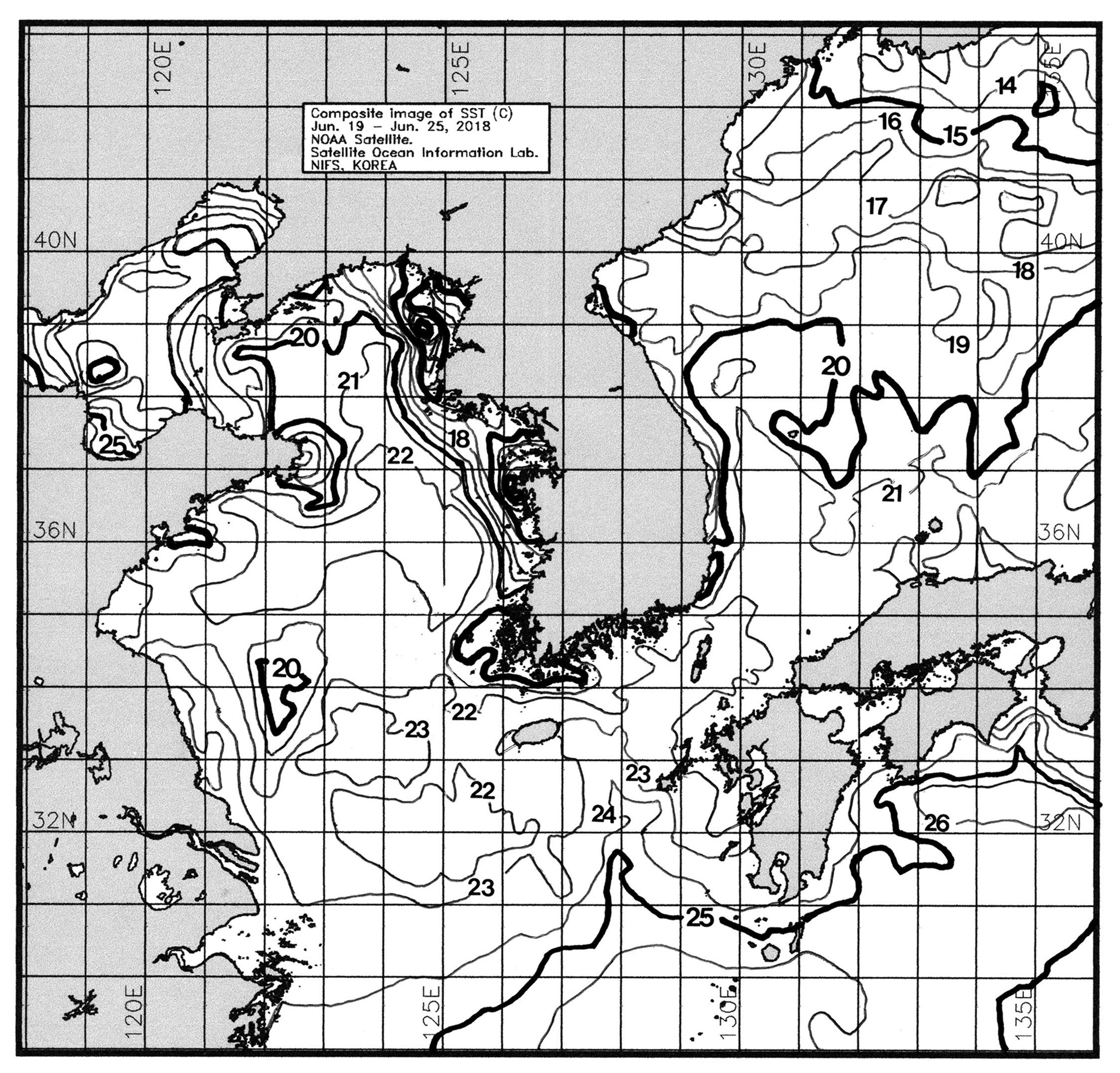 ○ 금주(2018. 06. 19 ~ 2018. 06. 25)의 한국근해 표면수온은 대화퇴 근해 18~19도, 울릉도-독도 근해 19~21도, 대마도 근해 22~23도, 제주도 근해 22~23도, 이어도 근해 21~23도, 가거초 근해 21~22, 어청도 근해 17~19도, 백령도 근해 14∼15도 로 나타납니다. ○ 「평년에 비해」대화퇴 근해 0.8도 낮게, 울릉도-독도 근해 1도 낮게, 대마도 근해 0.7도 높게, 제주도 근해 0.8도 높게, 이어도 근해 비슷하게, 가거초 근해 0.6도 높게, 어청도 근해 1.6도 낮게 나타납니다. ○ 「전년에 비해」대화퇴 비슷하게, 울릉도-독도 근해 1.5도 낮게, 대마도 근해 비슷하게, 제주도 근해 1.5도 높게, 이어도 근해 0.5도 낮게, 가거초 근해 비슷하게, 어청도 근해 3.5도 낮게, 백령도 근해 4도 낮게 나타납니다.