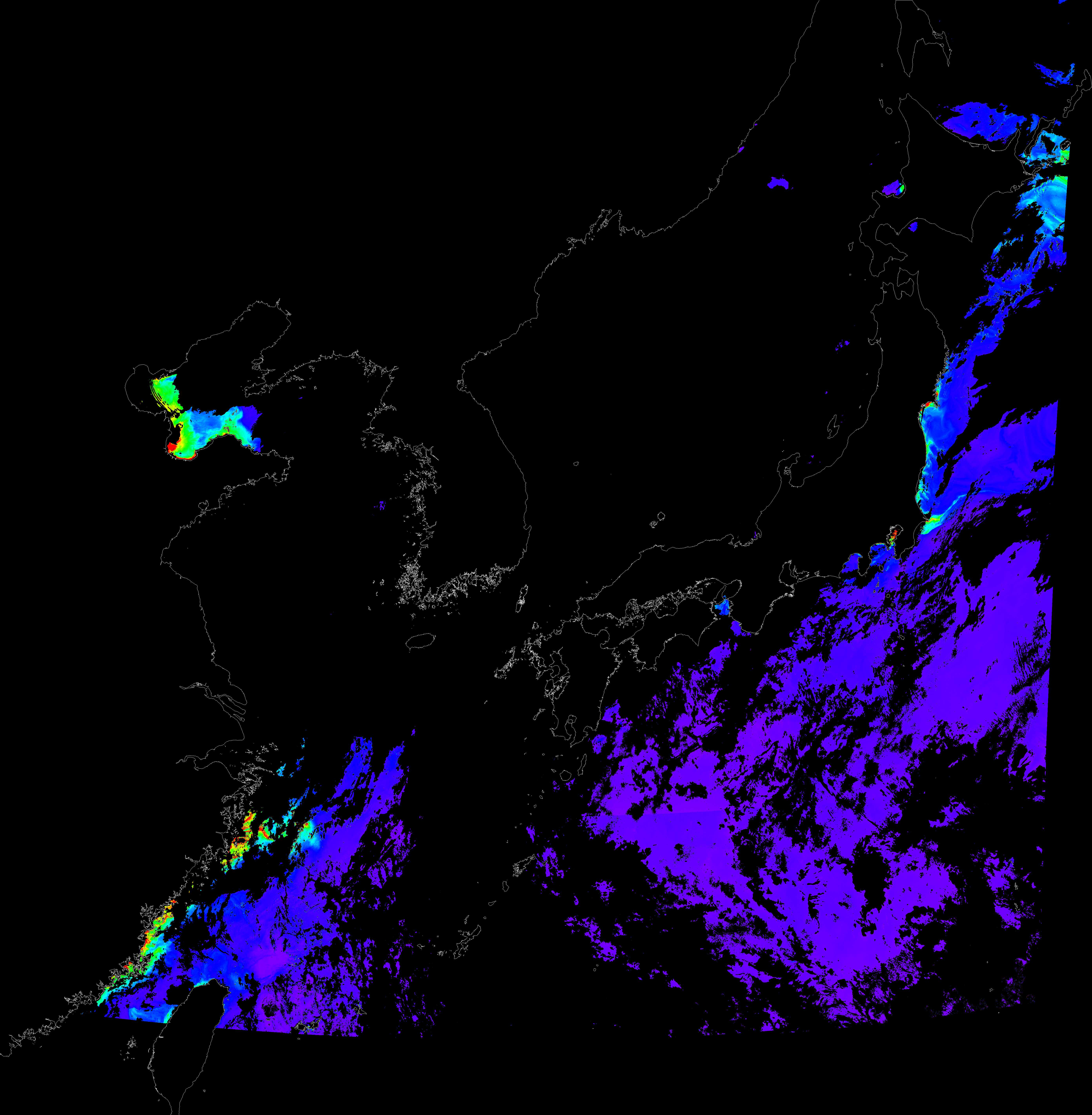 o 2018년 06월 30일 천리안 GOCI 클로로필 a 위성영상입니다. [ GOCI : Geostationary Ocean Color Imager ] o 농도분포는 하단 범례를 참고하시기 바랍니다. o 검은색은 구름을 나타냅니다.