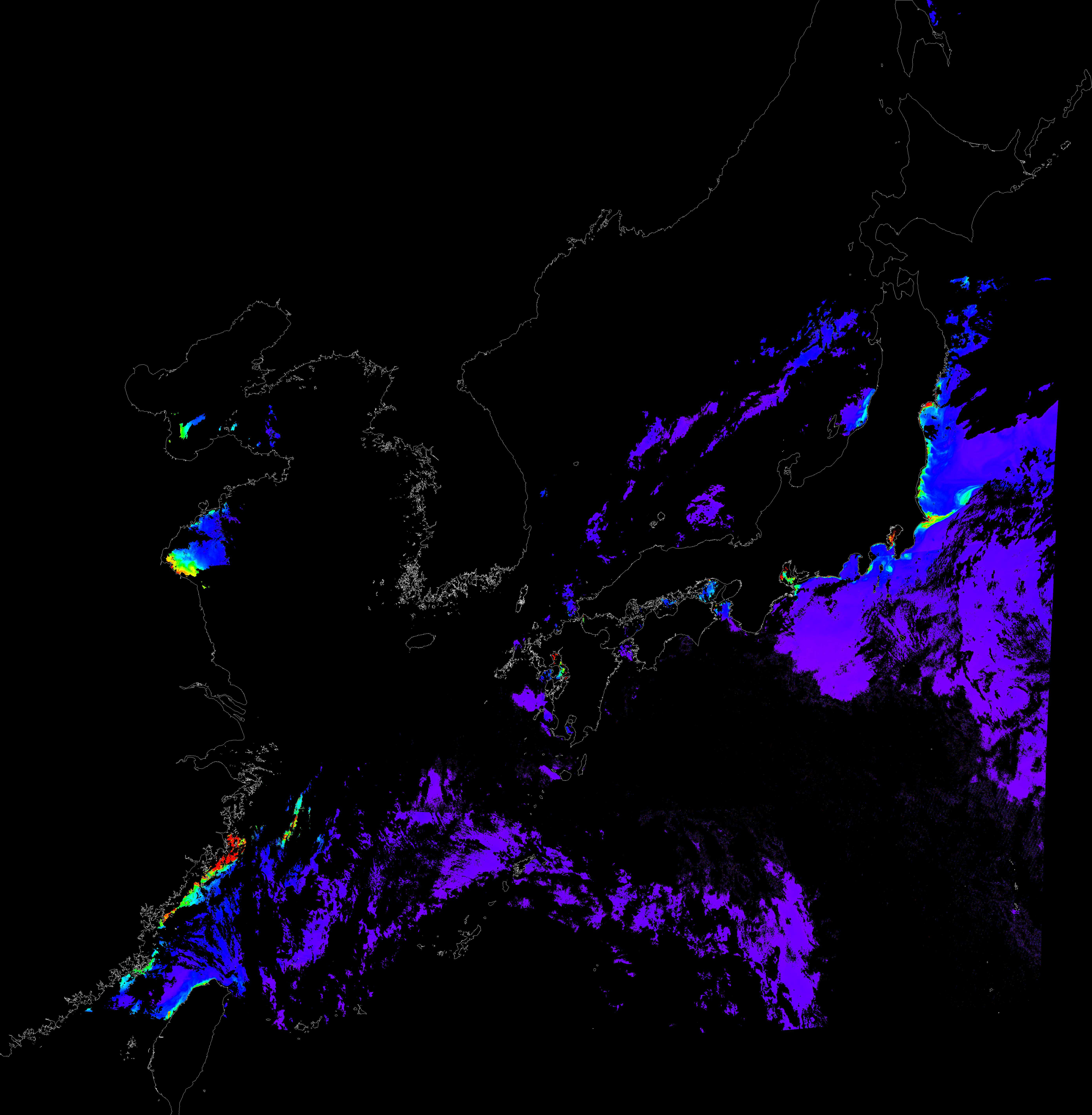 o 2018년 07월 01일 천리안 GOCI 클로로필 a 위성영상입니다. [ GOCI : Geostationary Ocean Color Imager ] o 농도분포는 하단 범례를 참고하시기 바랍니다. o 검은색은 구름을 나타냅니다.