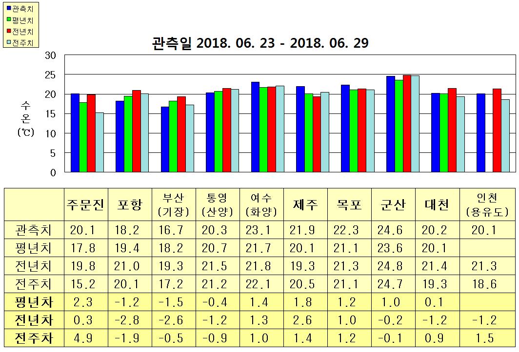 ○ 금주(2018. 06. 23 ~ 2018. 06. 29)의 한반도 연안 표면수온은 동해 연안역에서 섭씨 16.5~20.0도, 남해 연안역 20.5~23.0도, 서해 연안역에서 20.0~24.5도로 나타납니다. ○ 평년에 비해 주문진 2.3도 높음을 제외한 동해 연안역은 1.0~1.5도 낮게, 통영 0.4도 낮음을 제외한 남해 연안역은 1.5~2.0도 높게, 대천 비슷함을 제외한 서해 연안역은 1.0~1.5도 높게 나타납니다. ○ 전년에 비해 주문진 비슷함을 제외한 동해 연안역은 2.5~3.0도 낮게, 통영 1.2도 낮음을 제외한 남해 연안역은 1.5~2.5도 높게, 목포 1도 높음, 군산 비슷함을 제외한 서해 연안역은 1.0~1.5도 낮게 나타납니다.