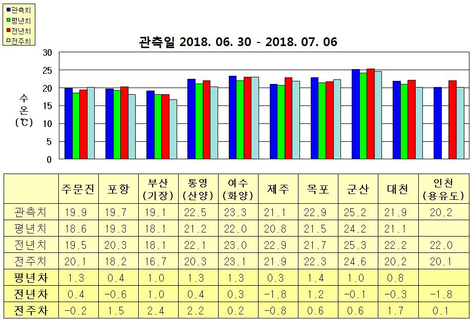 ○ 금주(2018. 06. 30 ~ 2018. 7. 06)의 한반도 연안 표면수온은 동해 연안역에서 섭씨 19~20도, 남해 연안역 21.0~23.5도, 서해 연안역에서 20.0~25.5도로 나타납니다. ○ 평년에 비해 동해 연안역은 0.5~1.5도 높게, 제주 비슷함을 제외한 남해 연안역은 1.0~1.5도 높게, 서해 연안역은 0.5~1.5도 높게 나타납니다. ○ 전년에 비해 포항 0.6도 낮음을 제외한 동해 연안역은 0.5~1.0도 높게, 남해 연안역은 통영(산양) 0.4도 높게, 여수(화양) 비슷하게, 제주 1.8도 낮게, 목포 1.2도 높음, 인천(용유도) 1.8도 낮음을 제외한 서해 연안역은 비슷하게 나타납니다.