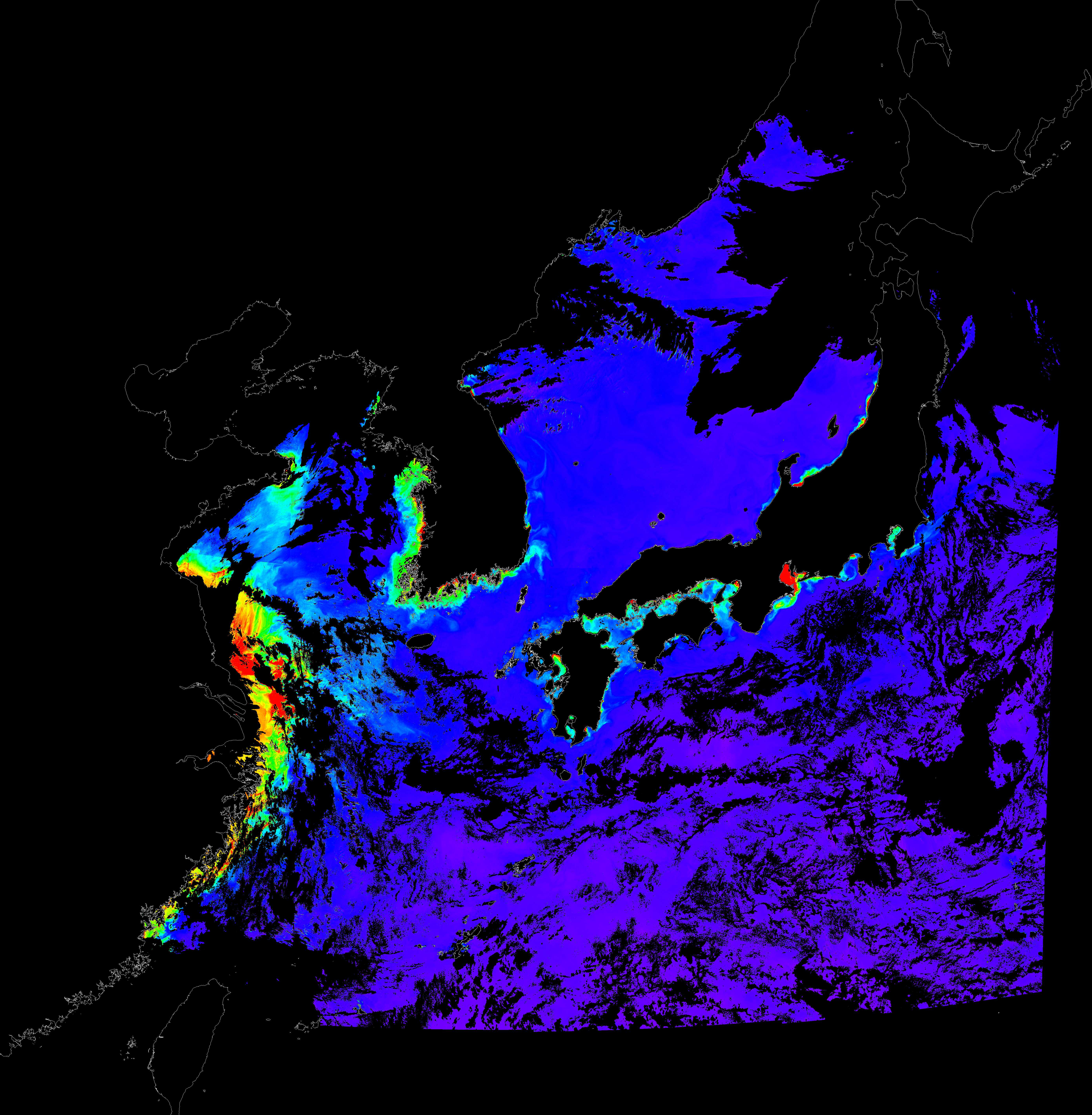 o 2018년 07월 15일 천리안 GOCI 클로로필 a 위성영상입니다. [ GOCI : Geostationary Ocean Color Imager ] o 농도분포는 하단 범례를 참고하시기 바랍니다. o 검은색은 구름을 나타냅니다.