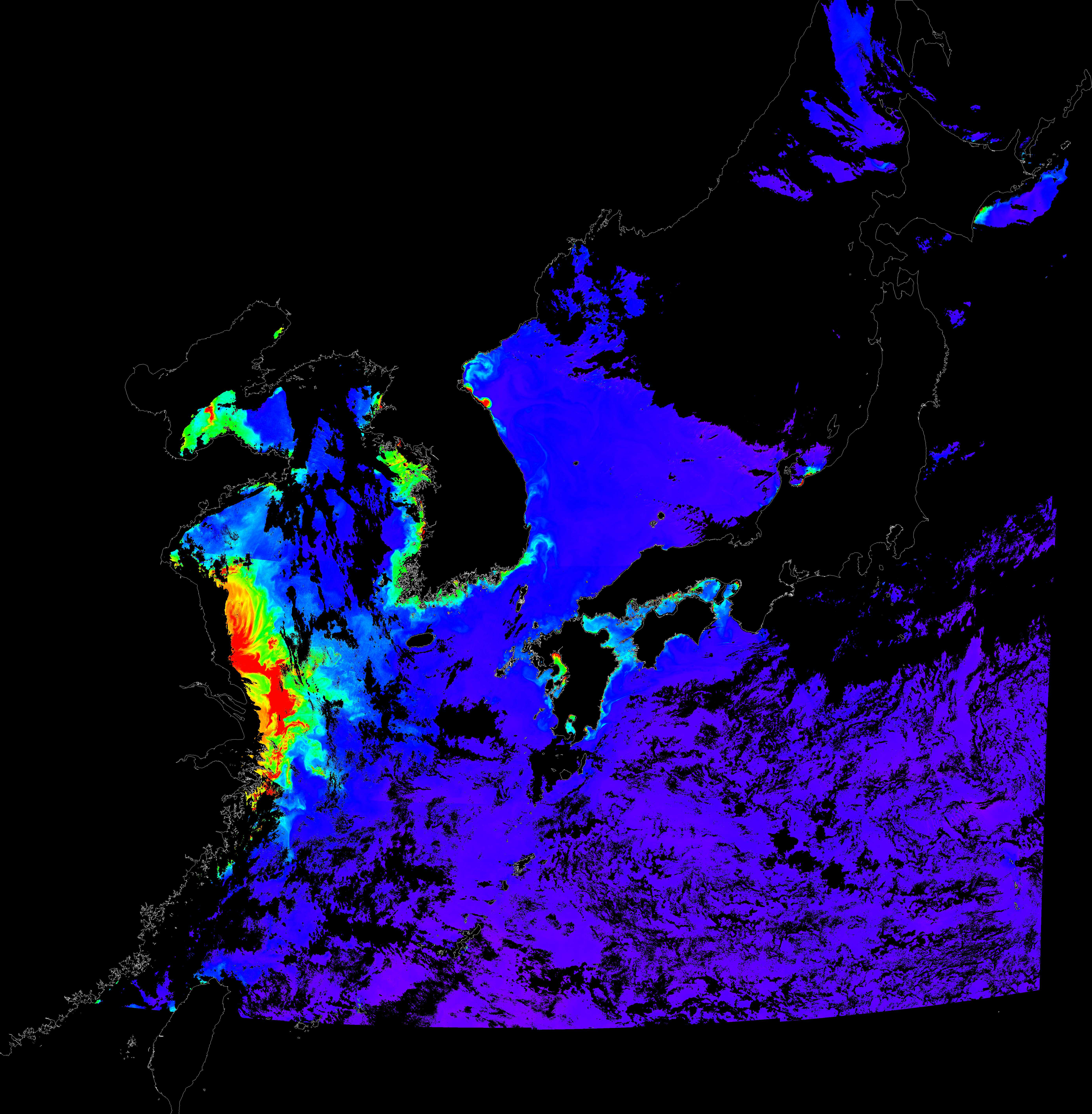 o 2018년 07월 16일 천리안 GOCI 클로로필 a 위성영상입니다. [ GOCI : Geostationary Ocean Color Imager ] o 농도분포는 하단 범례를 참고하시기 바랍니다. o 검은색은 구름을 나타냅니다.