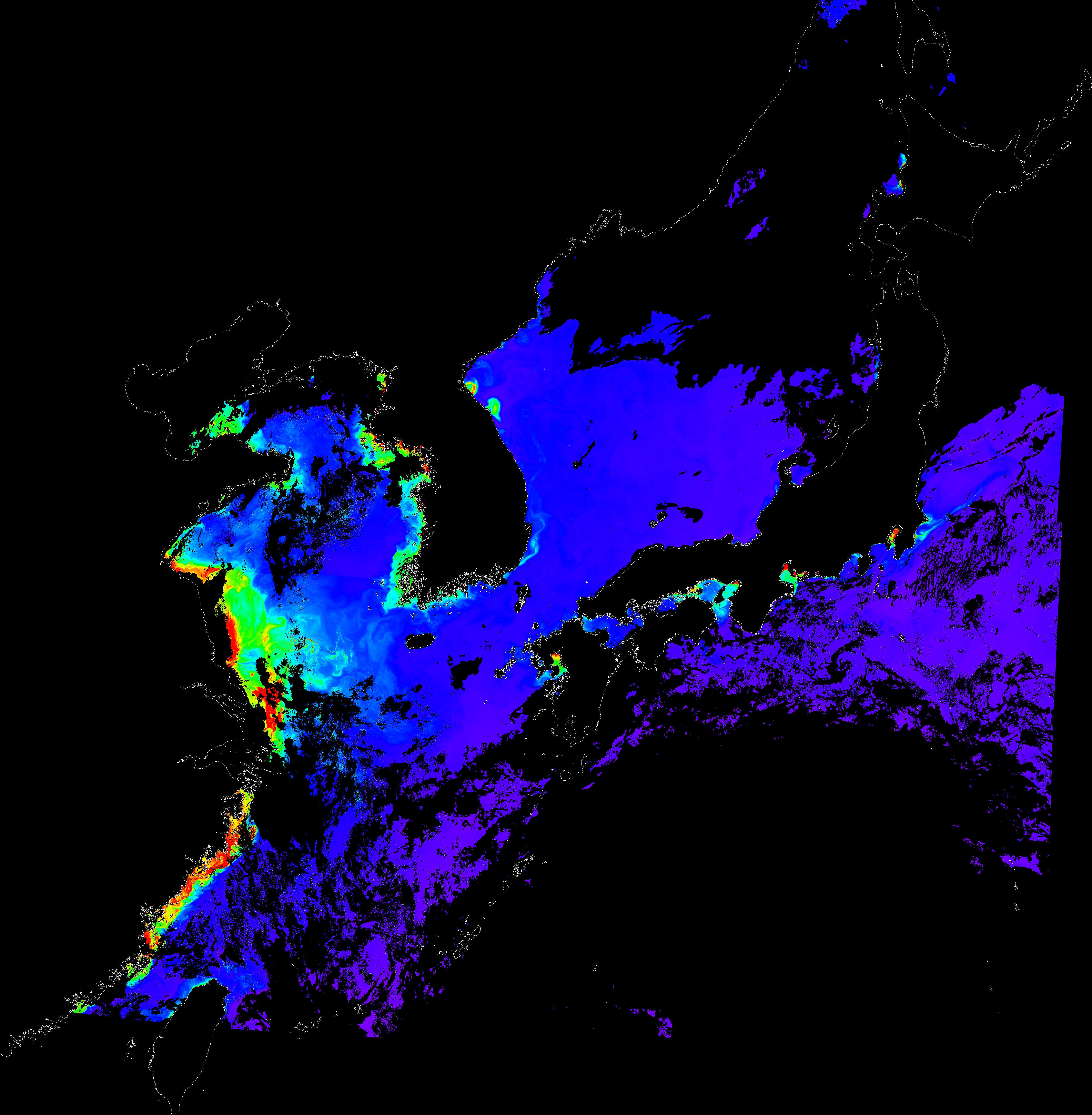 o 2018년 07월 20일 천리안 GOCI 클로로필 a 위성영상입니다. [ GOCI : Geostationary Ocean Color Imager ] o 농도분포는 하단 범례를 참고하시기 바랍니다. o 검은색은 구름을 나타냅니다.