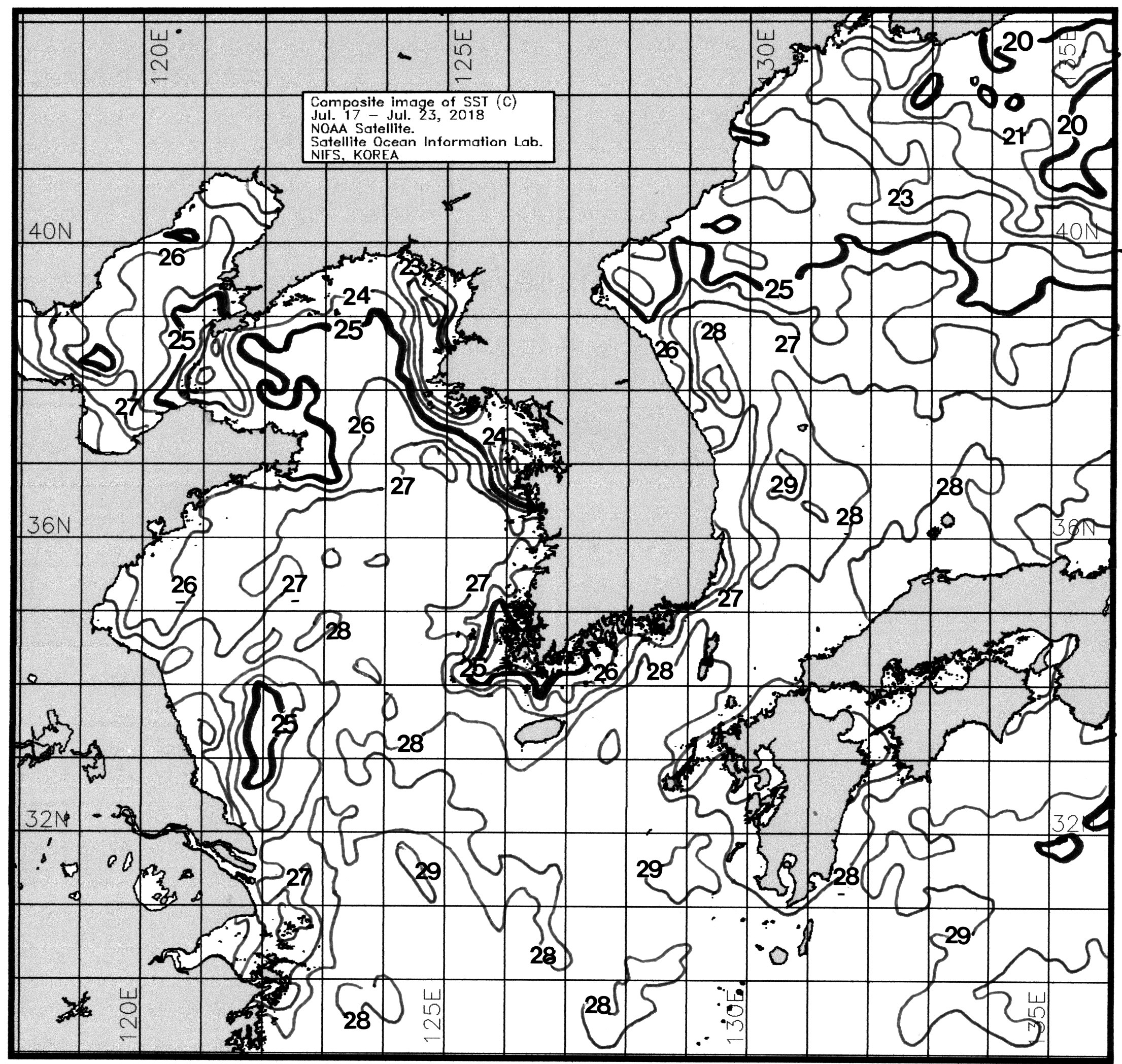 ○ 금주(2018. 07. 17 ~ 2018. 07. 23)의 한국근해 표면수온은 대화퇴 근해 24~25도, 울릉도-독도 근해 27~28도, 대마도 근해 27~29도, 제주도 근해 27~28도, 이어도 근해 27~28도, 가거초 근해 26~27, 어청도 근해 27~28도, 백령도 근해 22∼23도 로 나타납니다. ○ 「평년에 비해」대화퇴 근해 1.2도 높게, 울릉도-독도 근해 3.5도 높게, 대마도 근해 2도 높게, 제주도 근해 0.9도 높게, 이어도 근해 비슷하게, 가거초 근해 비슷하게, 어청도 근해 3도 높게 나타납니다. ○ 「전년에 비해」대화퇴 1도 낮게, 울릉도-독도 근해 2도 높게, 대마도 근해 0.5도 높게, 제주도 근해 2도 낮게, 이어도 근해 2도 낮게, 가거초 근해 1.5도 낮게, 어청도 근해 2도 높게, 백령도 근해 3도 낮게 나타납니다.
